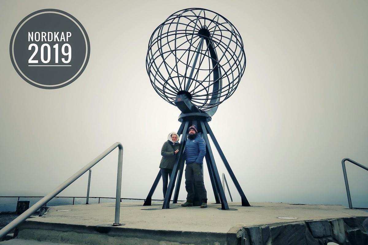 Zwei Personen stehen vor einem Globus auf einem Sockel