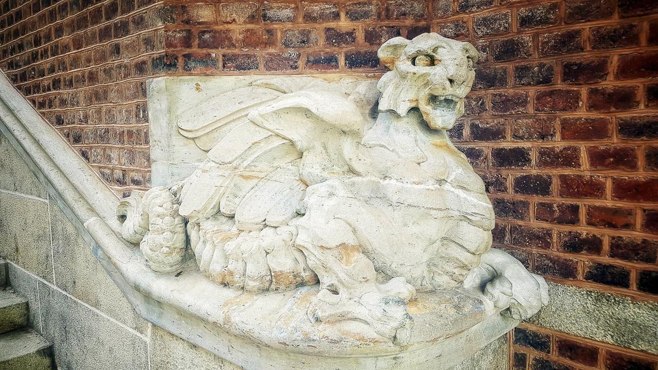 Skulptur eines geflügelten Löwen auf einer Treppenstufe aus Stein