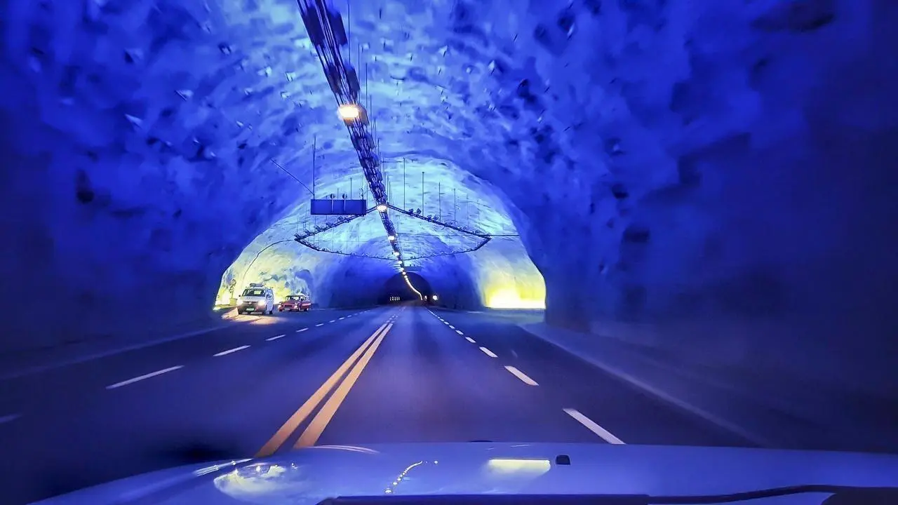 Tunnel mit blauer Beleuchtung und Fahrbahnmarkierungen, Fahrzeug fährt hindurch