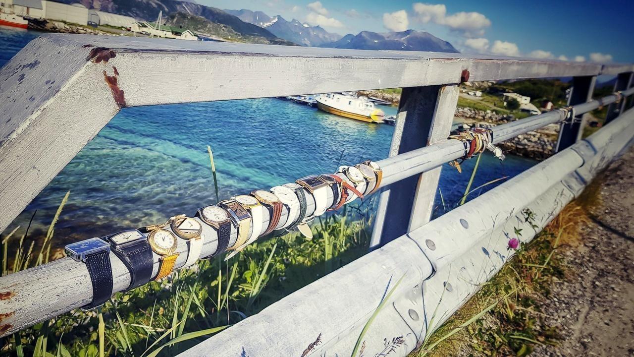 Uhren sind an einem Geländer entlang einer Küstenstraße befestigt