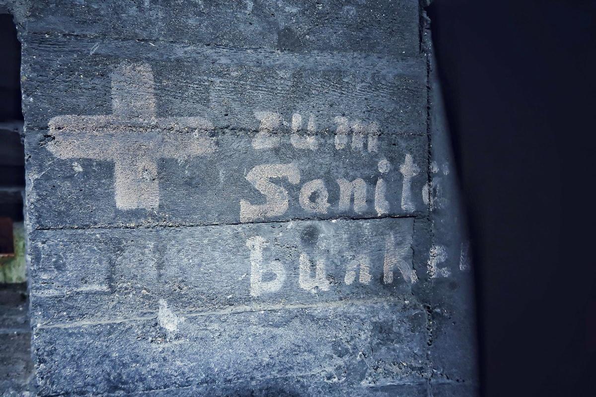 Wand mit verblasster Schrift und einem Kreuz, Hinweis auf Sanitärbunker