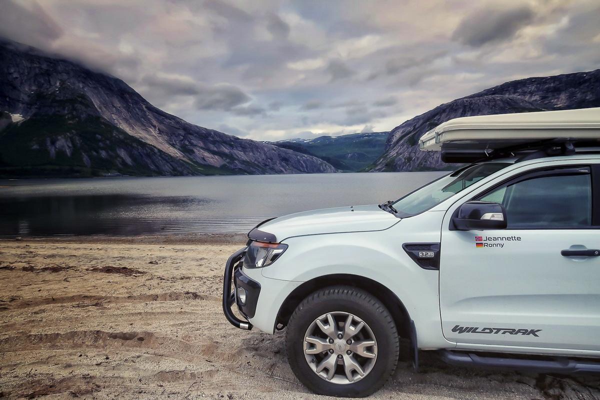 Weißes Fahrzeug mit Dachzelt vor einer Berglandschaft am Wasser