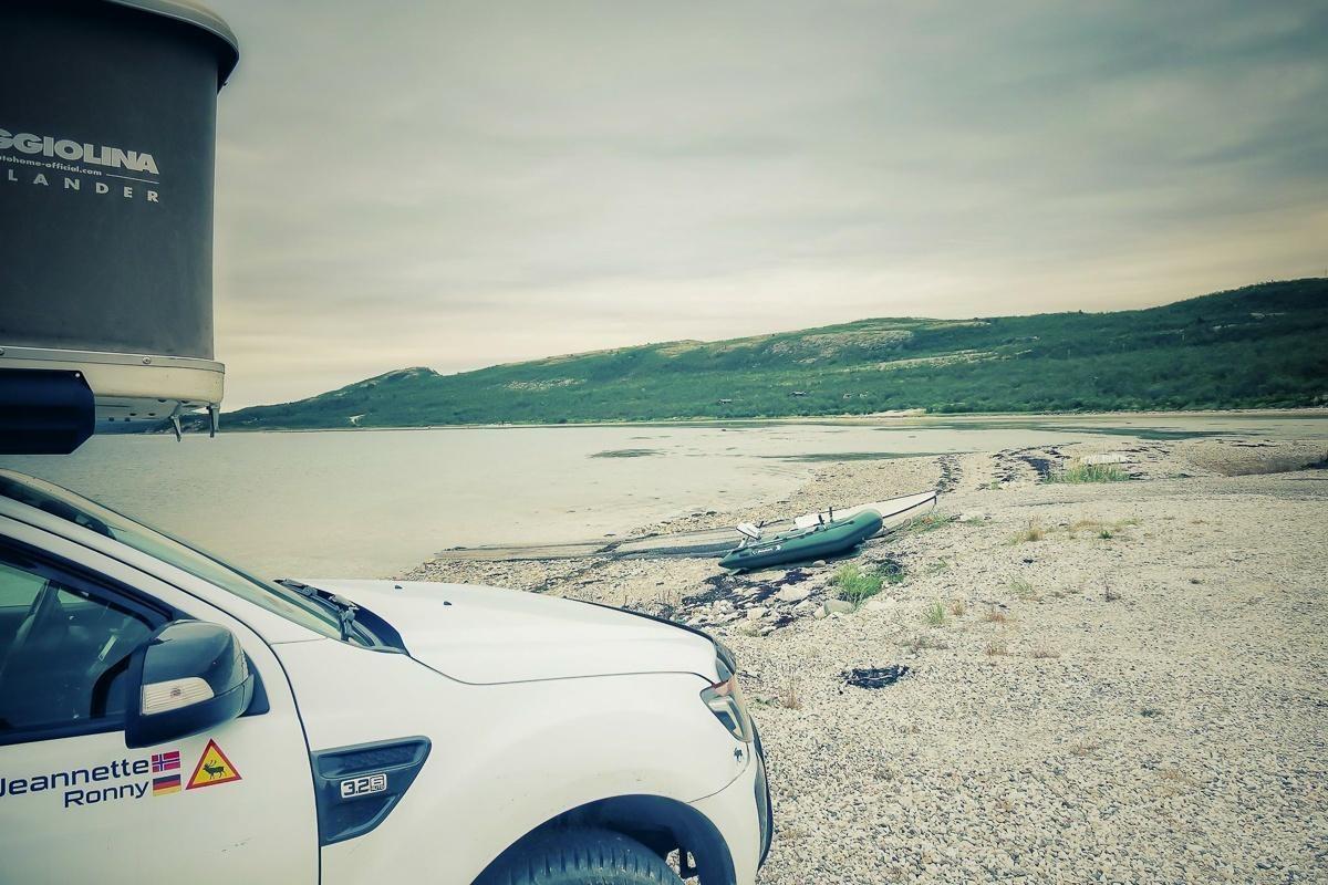 Weißer Geländewagen parkt am Ufer eines Sees, im Hintergrund Berge und Wolken