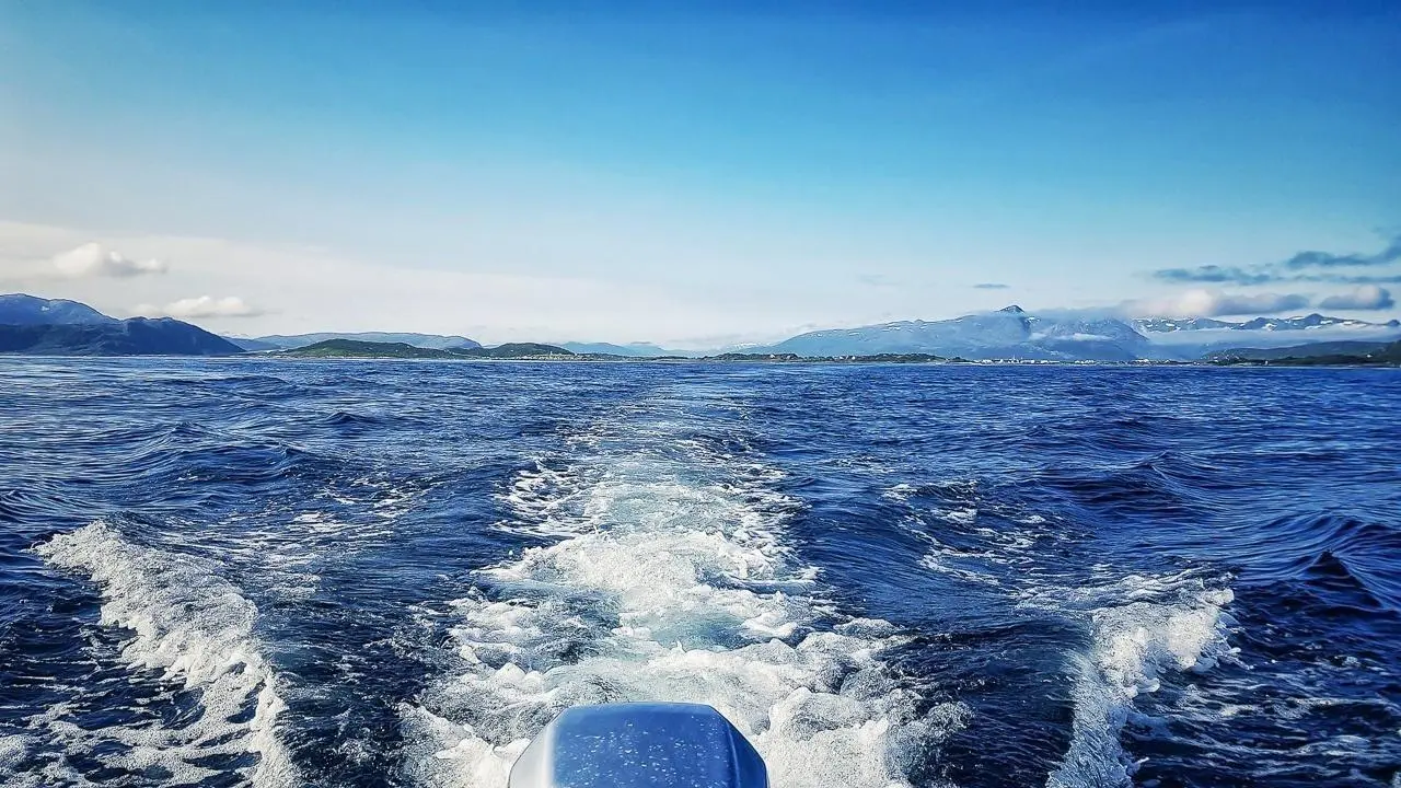 Wellen hinter einem Boot auf offenem Wasser mit Bergen im Hintergrund