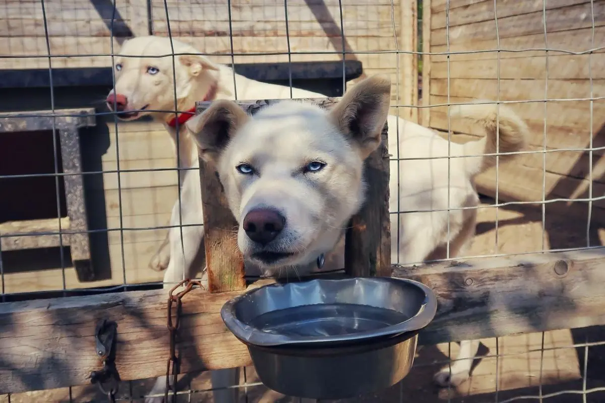 Zwei Hunde in einem Gehege, einer mit Kopf durch eine Öffnung und Wassernapf