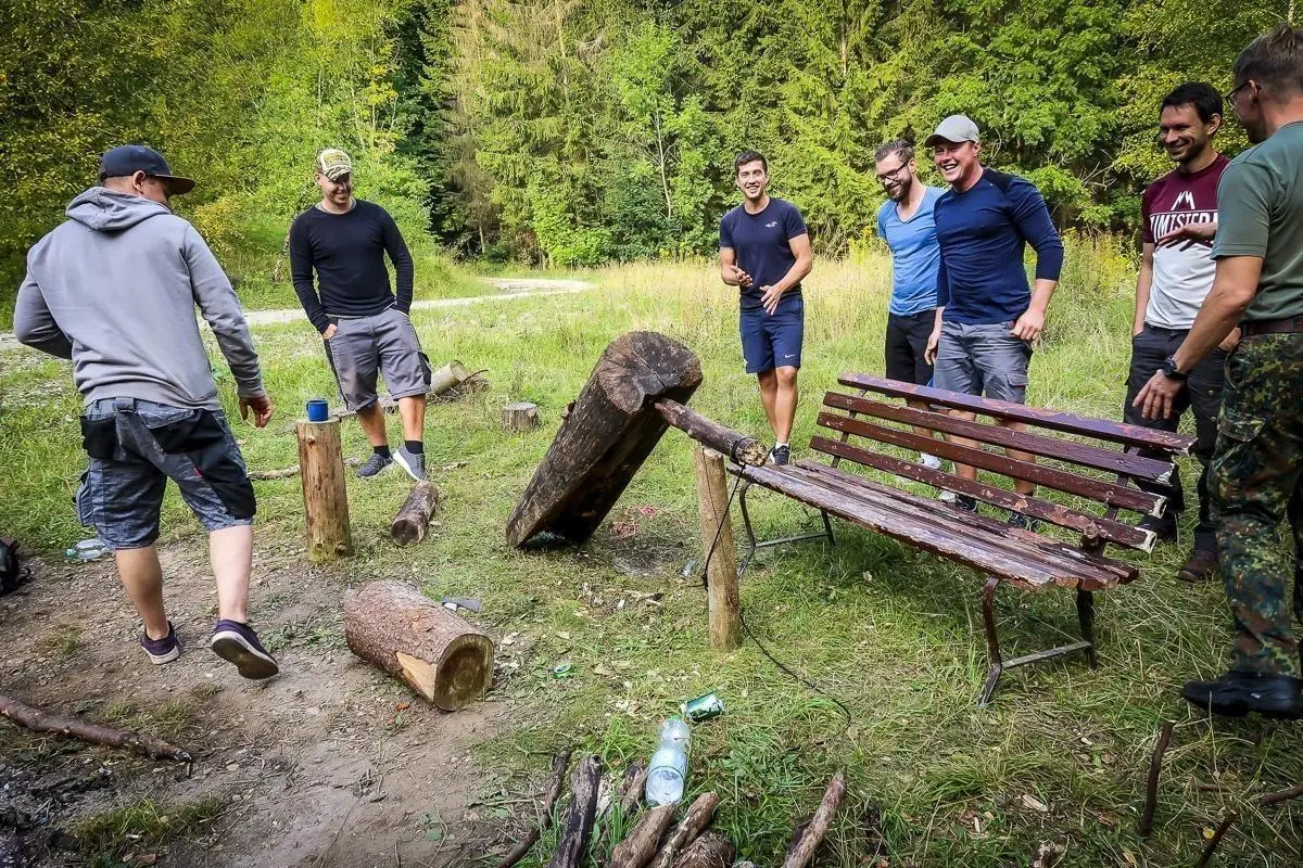 Gruppe arbeitet an einer selbstgebauten Bank aus Holz und Baumstämmen
