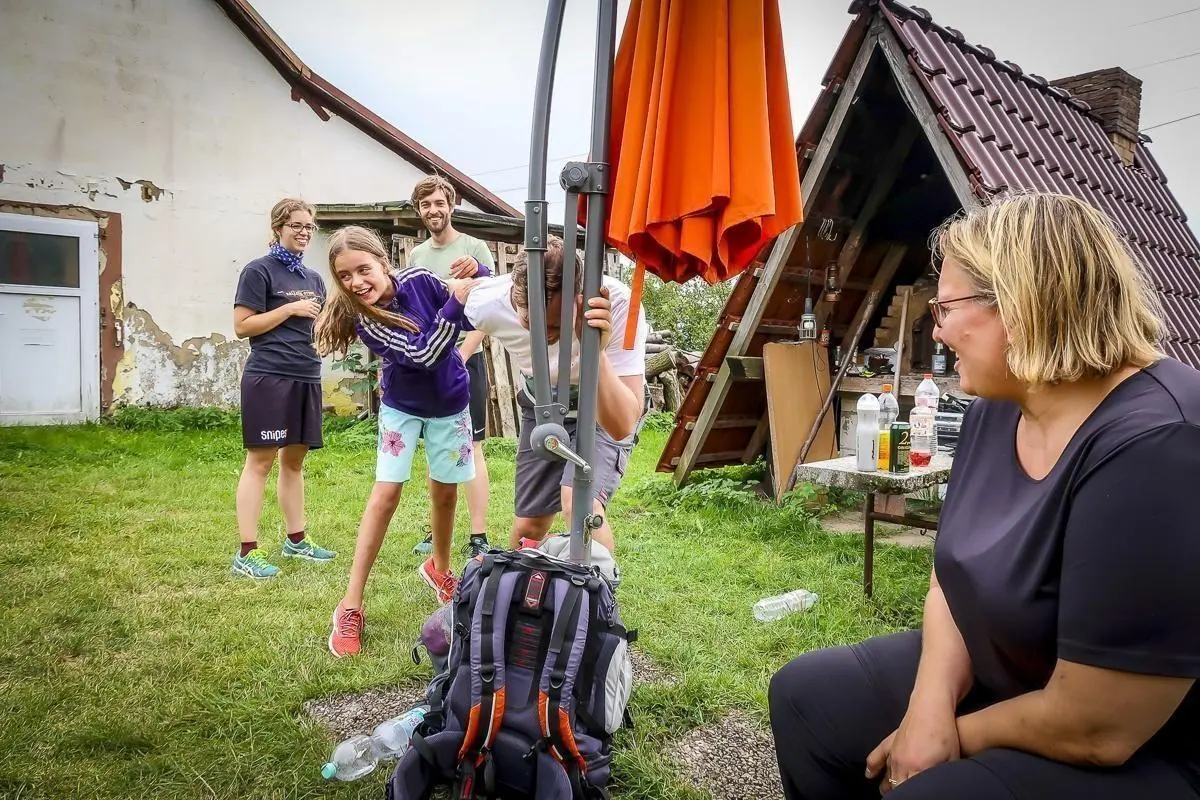 Gruppe von fünf Personen interagiert im Freien, eine Person hält einen Rucksack