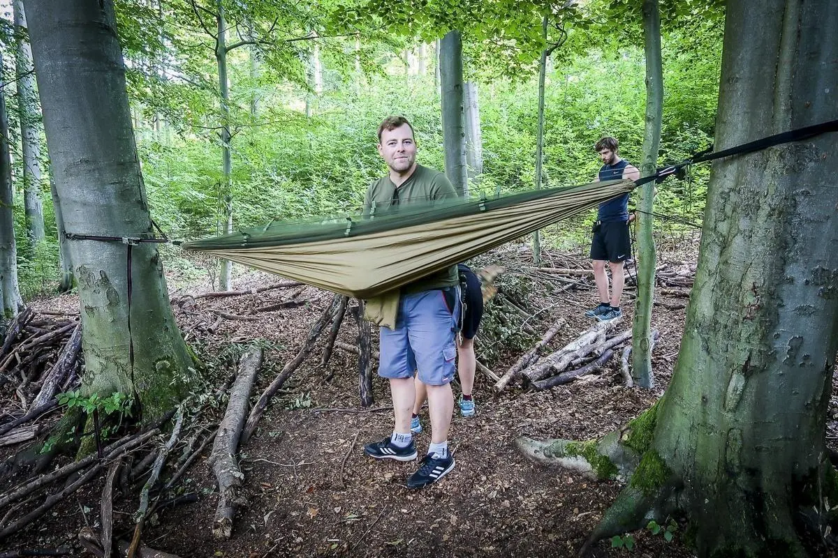 Hängematte wird zwischen zwei Bäumen gespannt, während eine Person sie hält