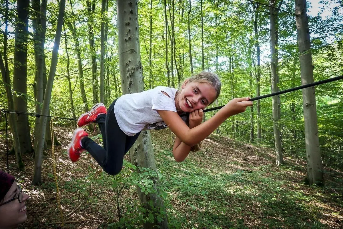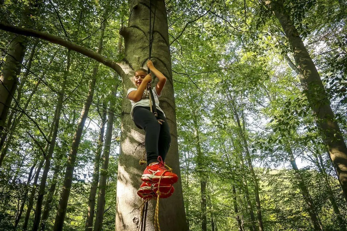 Kind klettert an einem Seil, das an einem Baum befestigt ist
