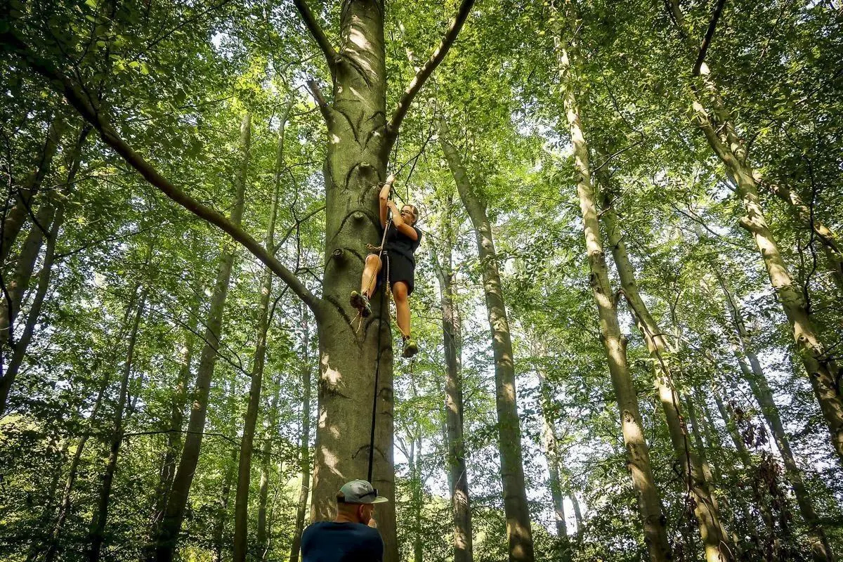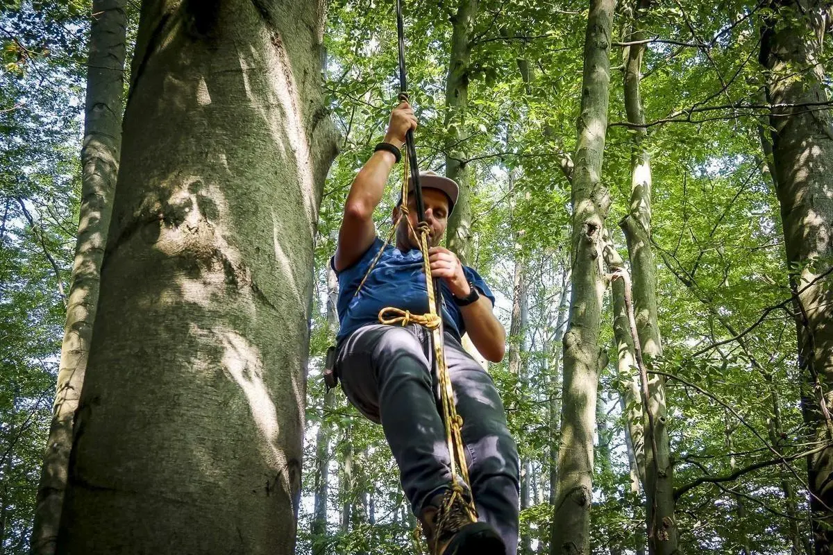 Klettert an einem Baum mit Seil und Kletterausrüstung