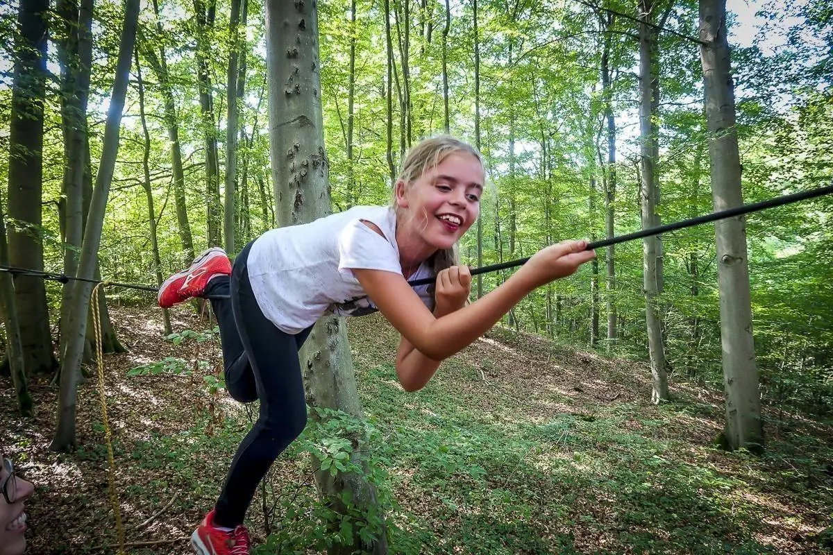 Mädchen überquert selbstgebaute Seilbrücke zwischen Bäumen im Wald