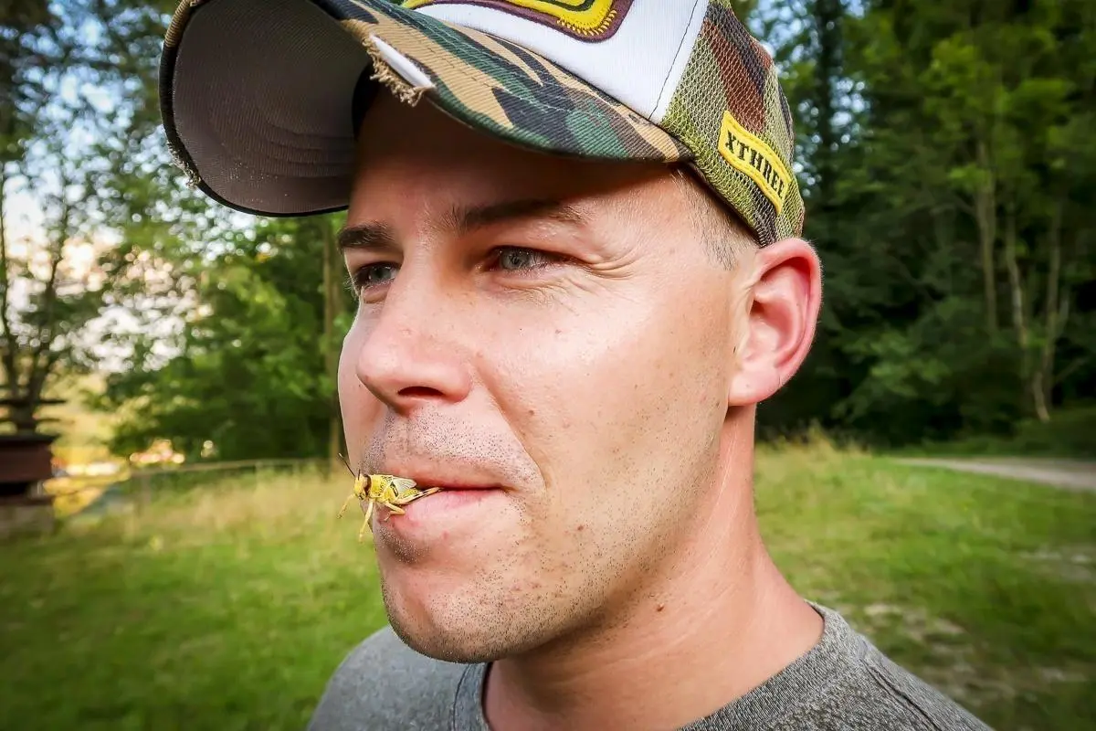 Mann mit einer Heuschrecke im Mund steht in einer grünen Umgebung