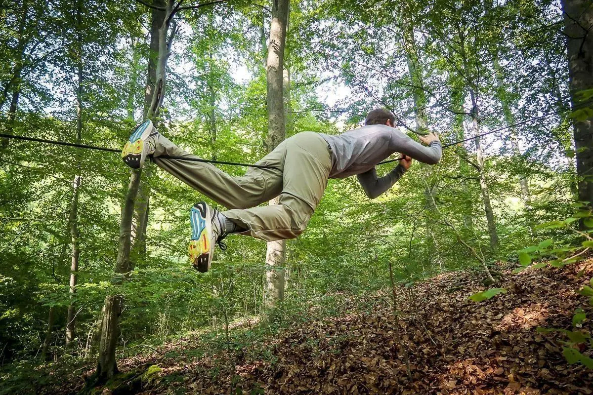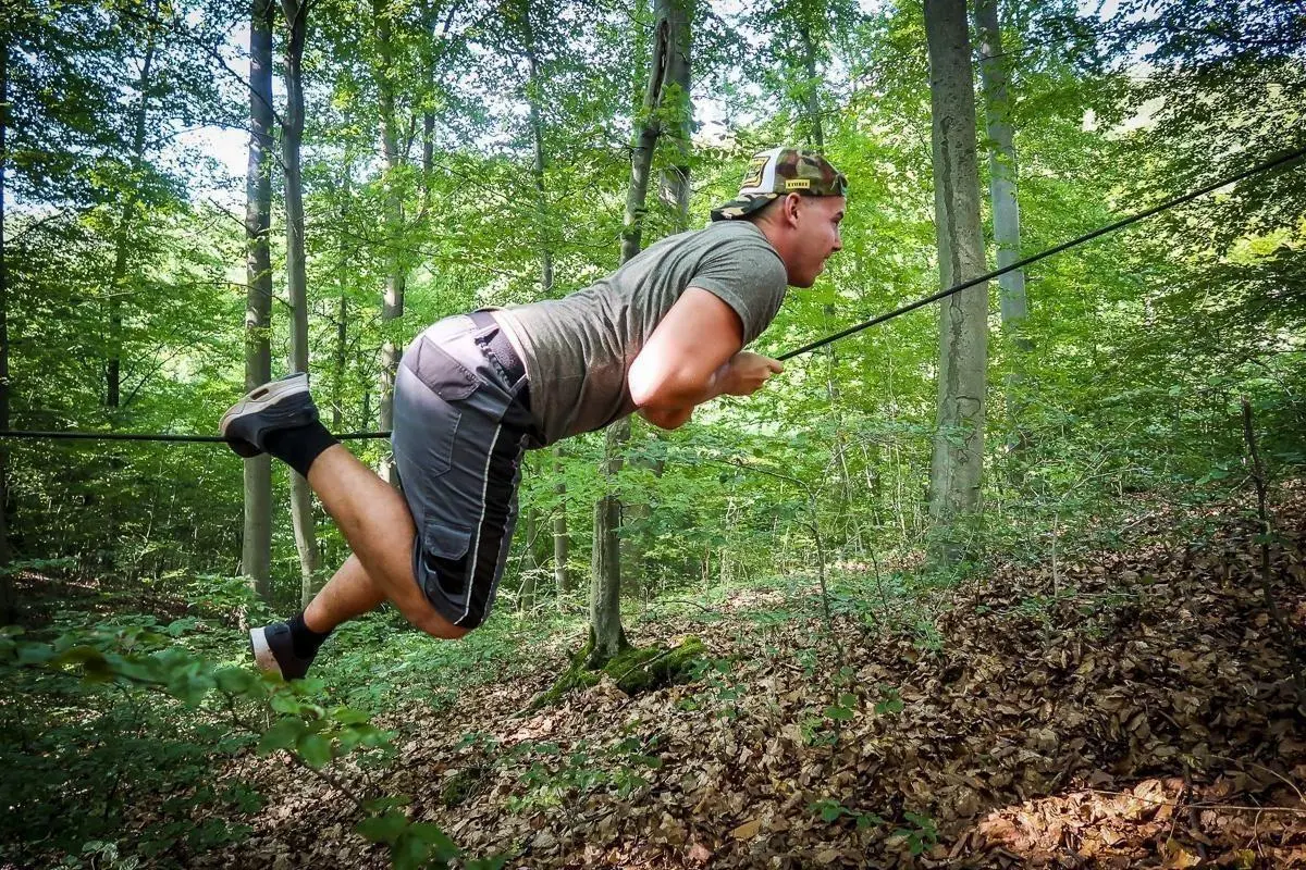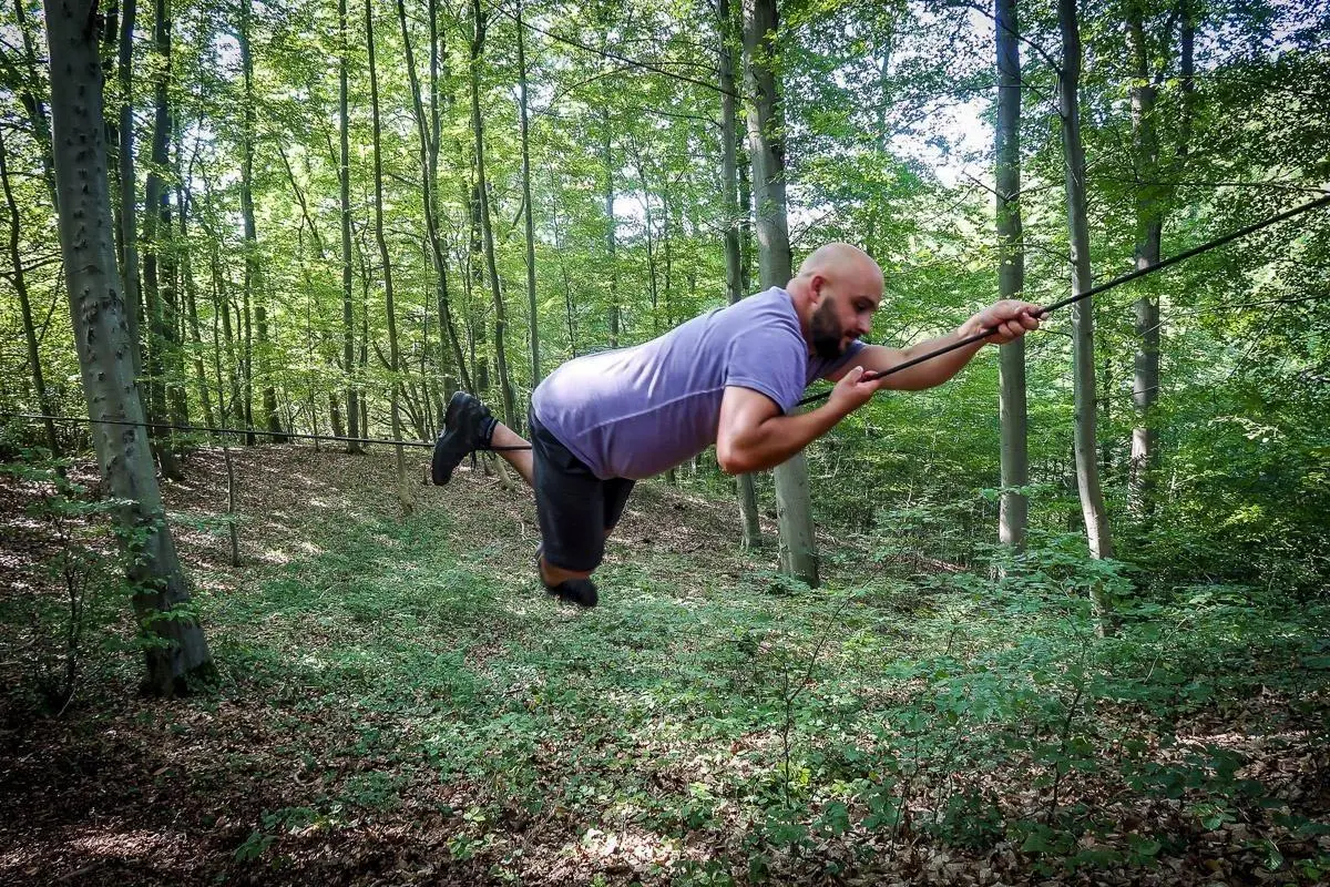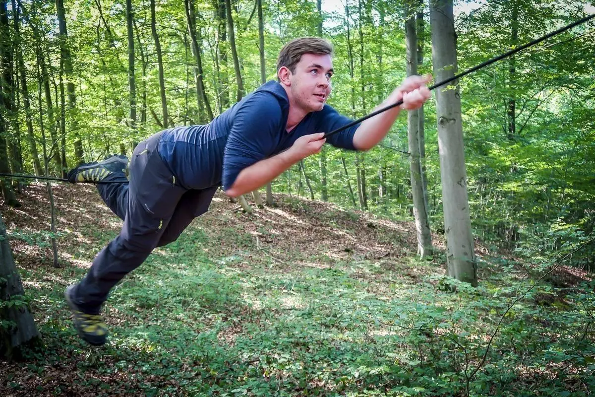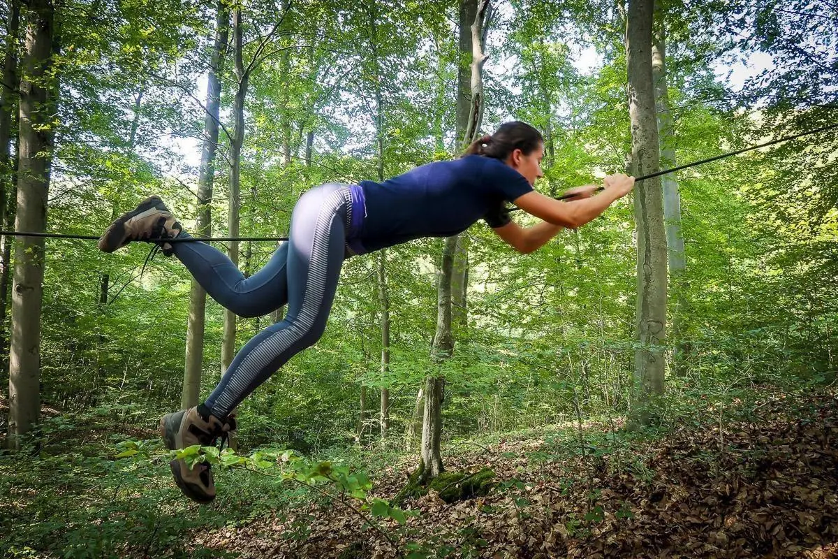 Seilquerung über den Boden im Wald, Körper in horizontaler Position