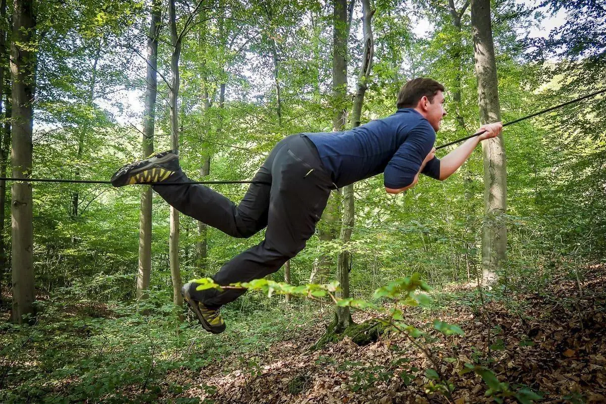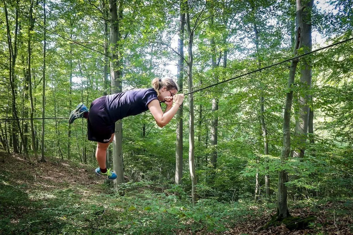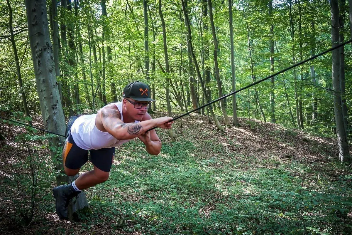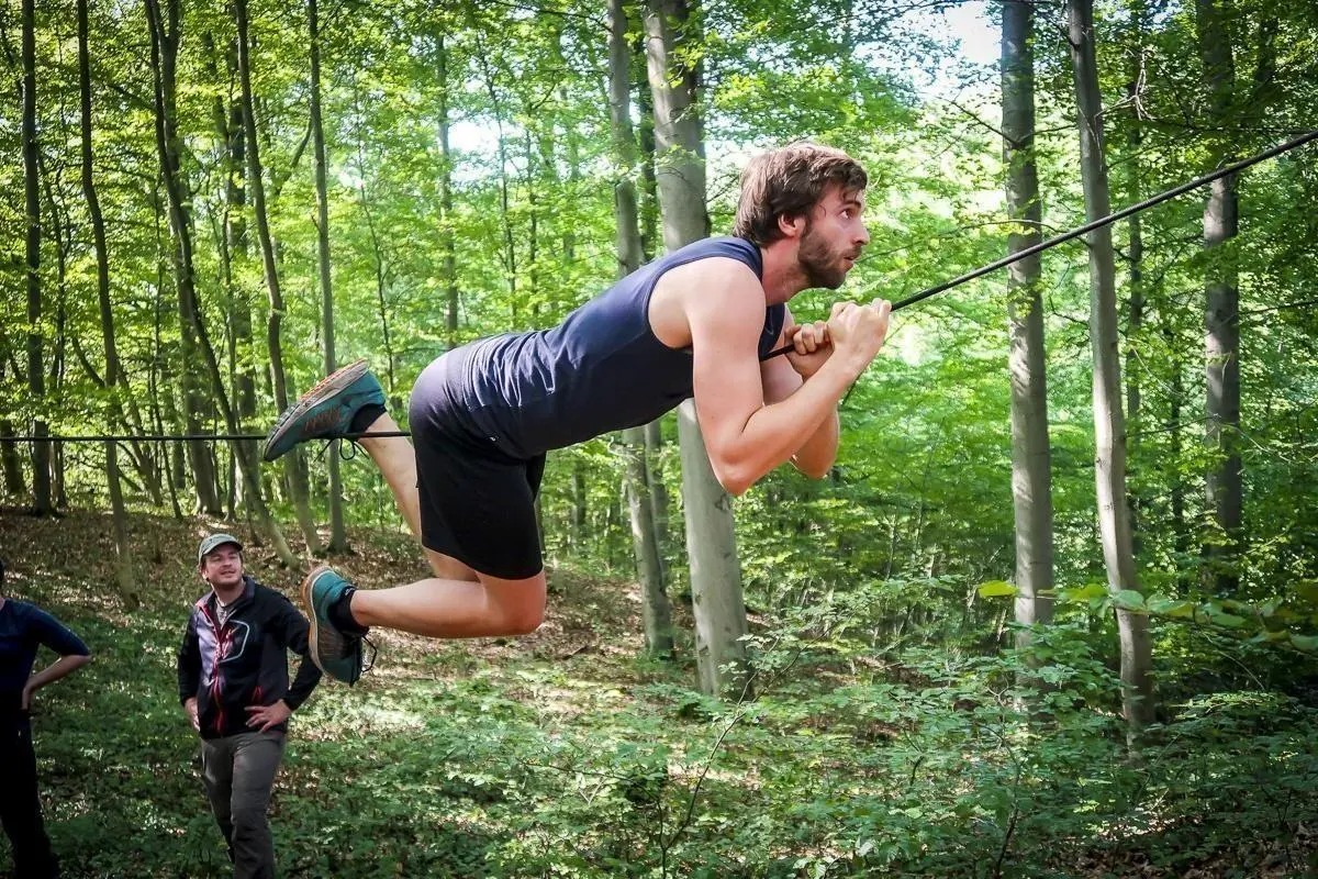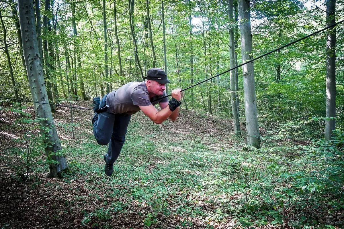Seilquerung über den Boden im Wald, Körper in horizontaler Position
