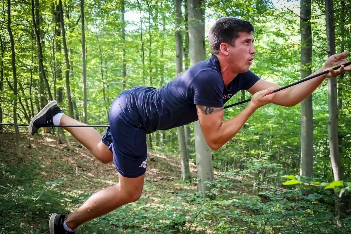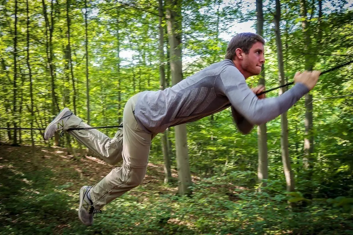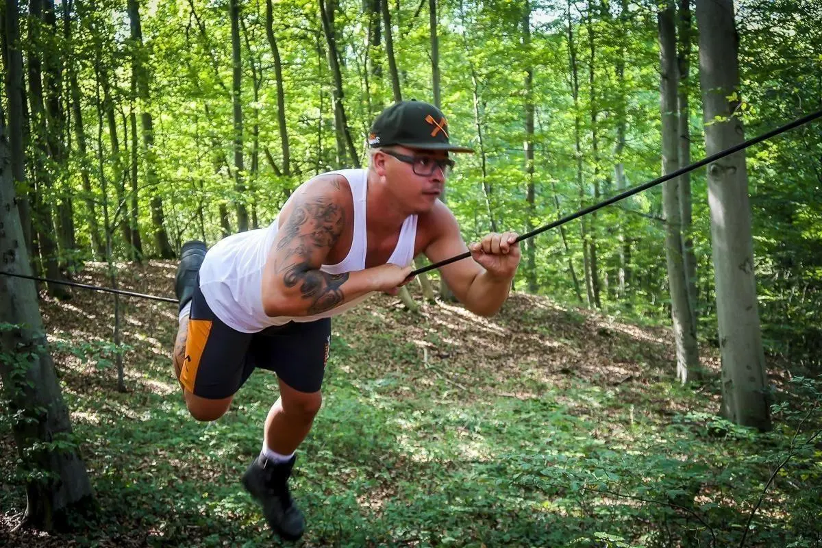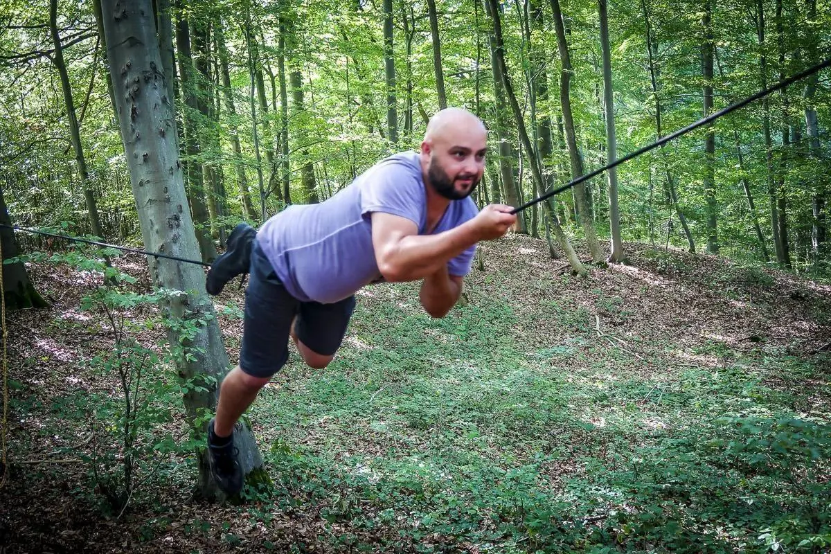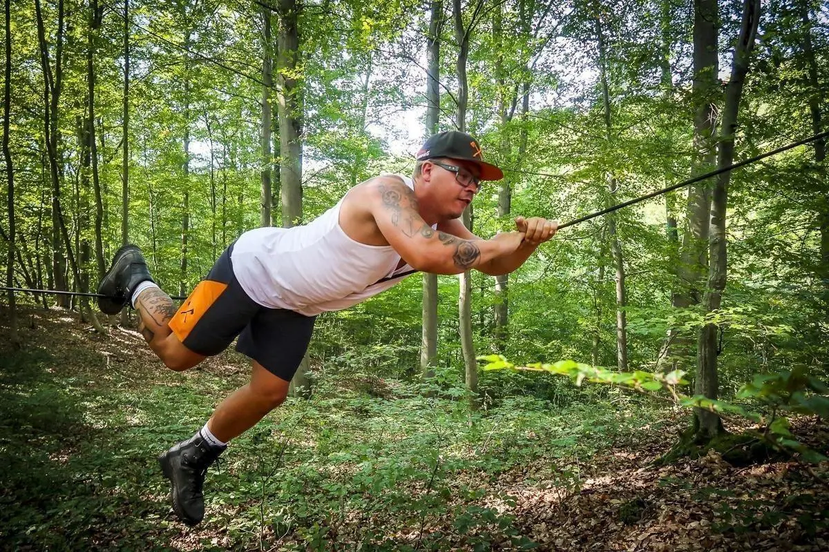 Seilquerung über den Boden im Wald, Körper in horizontaler Position