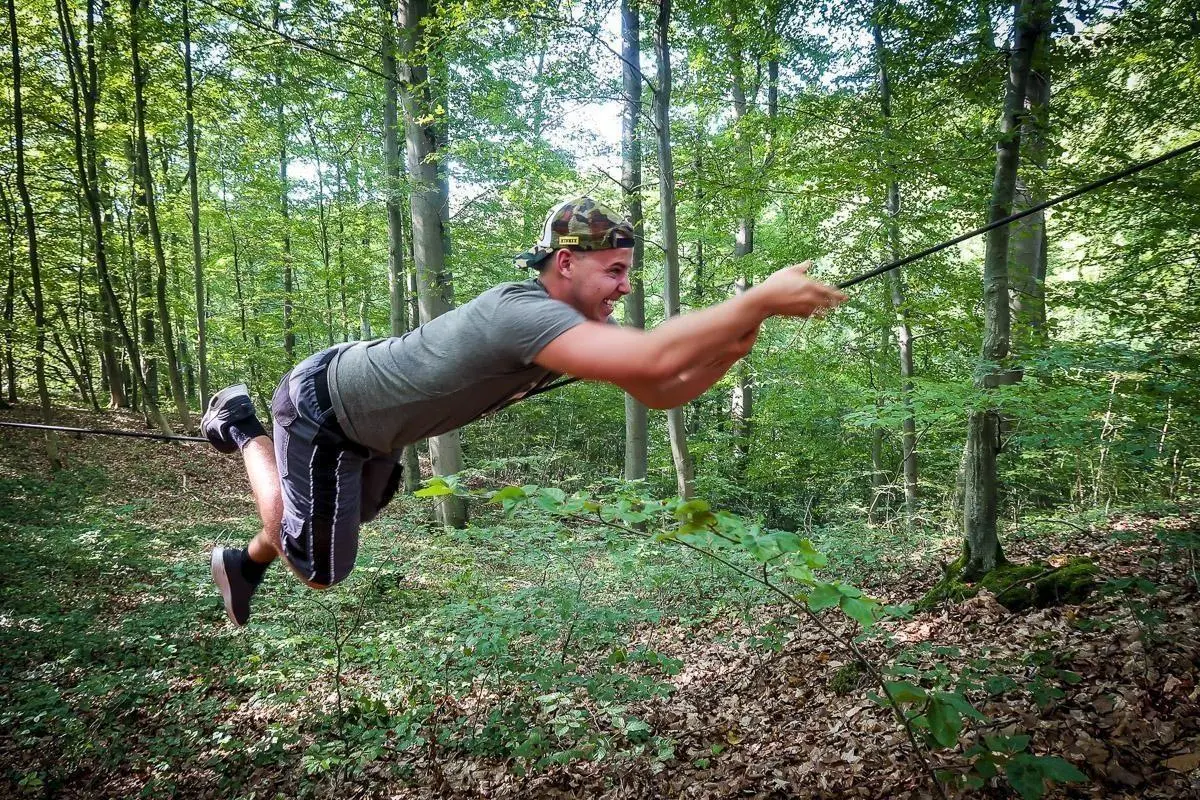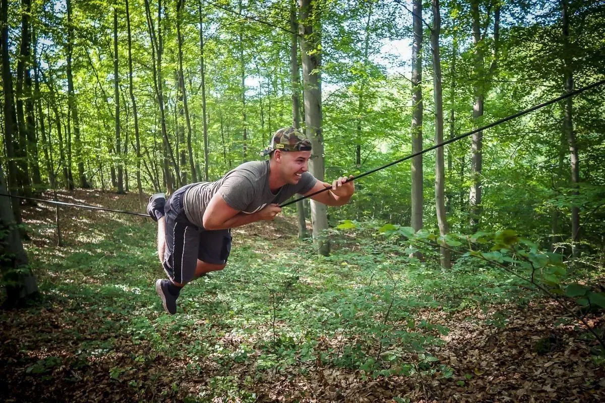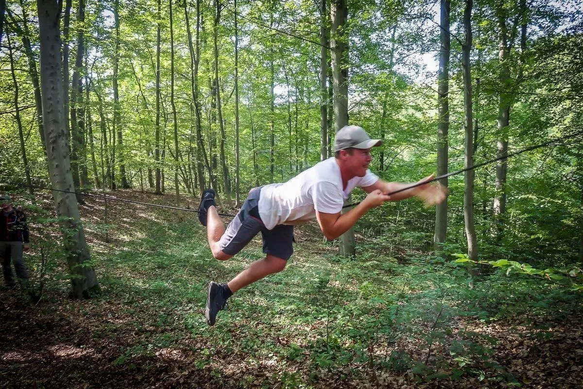 Selbstgebaute Seilquerung wird zwischen zwei Bäumen genutzt