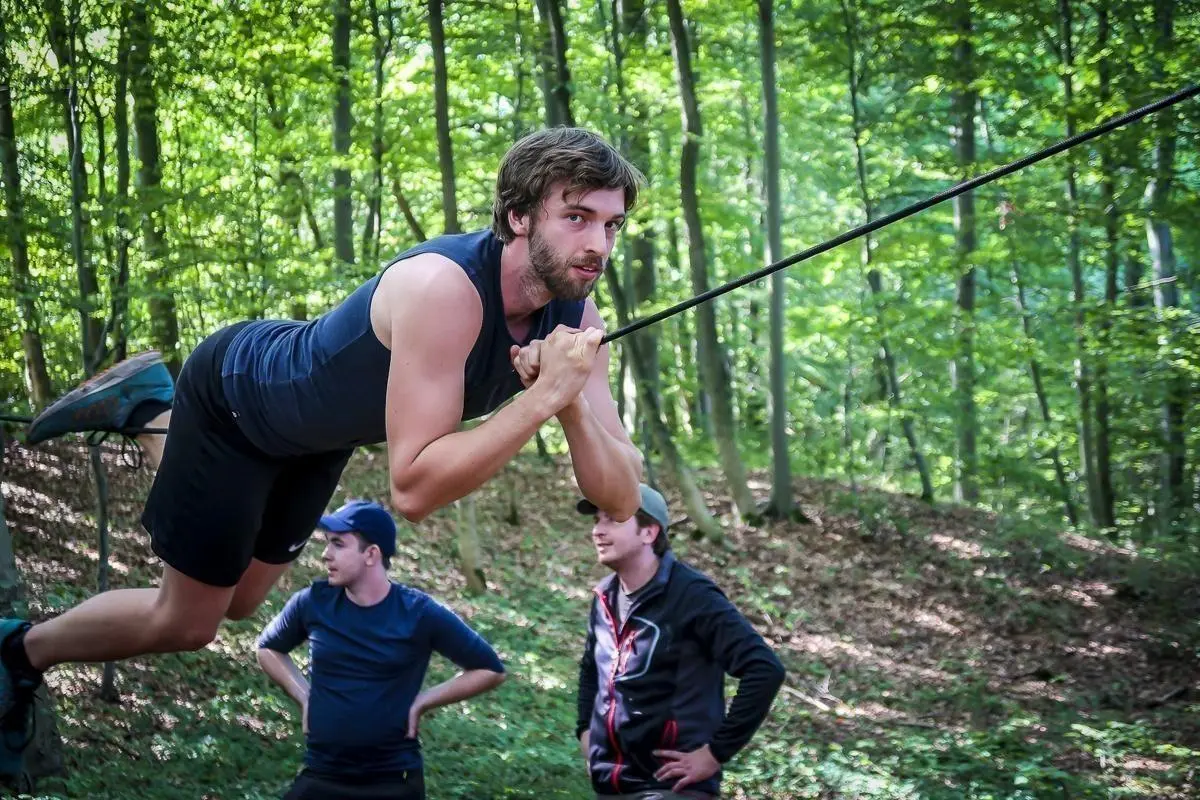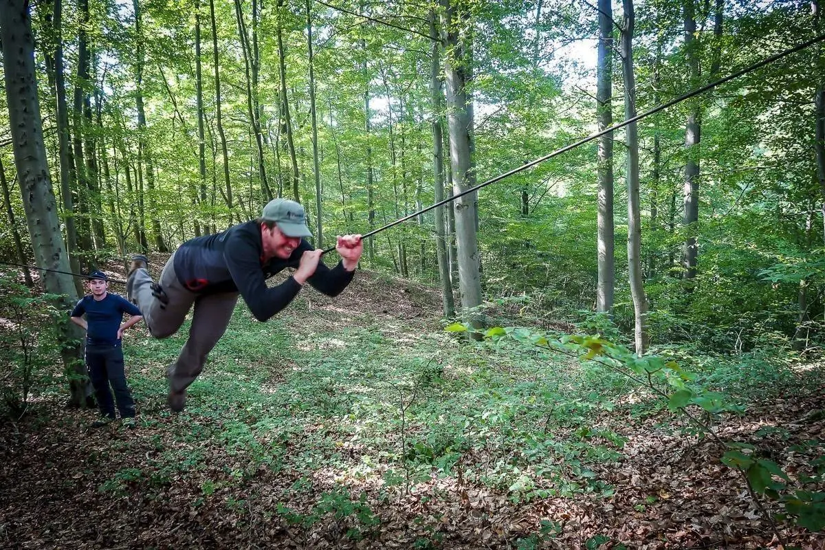 Mann überquert selbstgebaute Seilbrücke im Wald, während ein Zuschauer zusieht