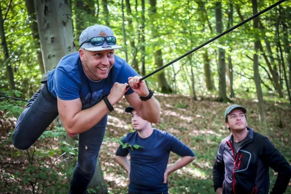 Gruppenteilnehmer üben eine Seilquerung in der Natur mit einem improvisierten Seil