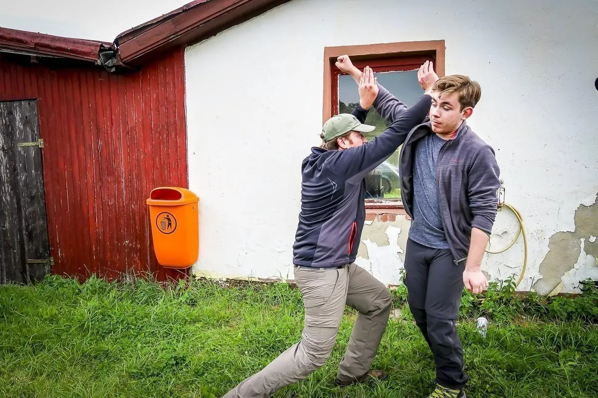 Zwei Personen üben eine Selbstverteidigungstechnik vor einer kleinen Hütte