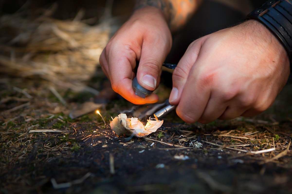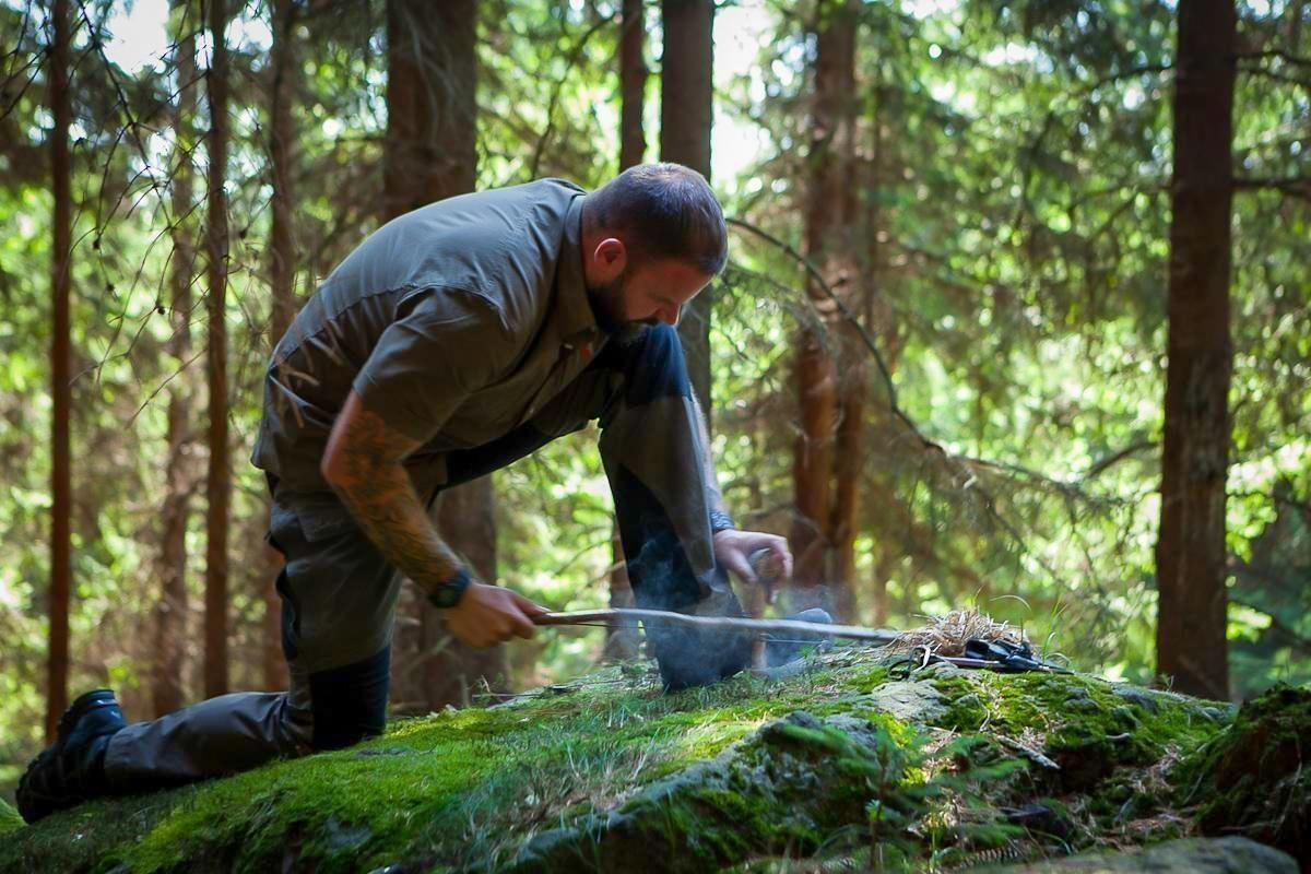 Mann zündet Zunder mit einem Feuerstahl auf moosbedecktem Stein an