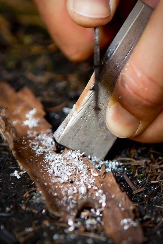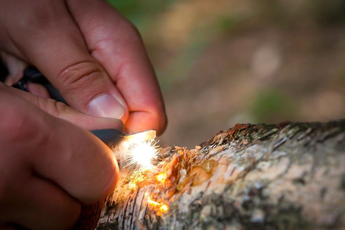 Feuerstahl erzeugt Funken auf Zunderstücken an einem Baumstamm