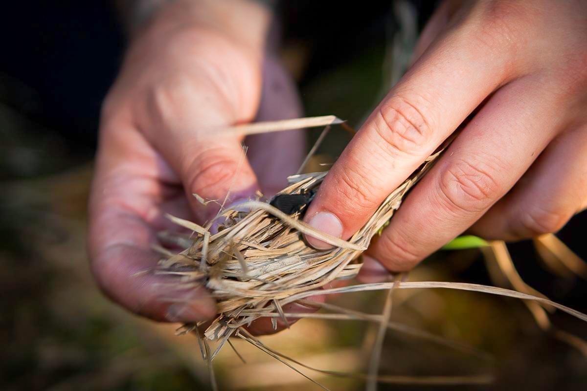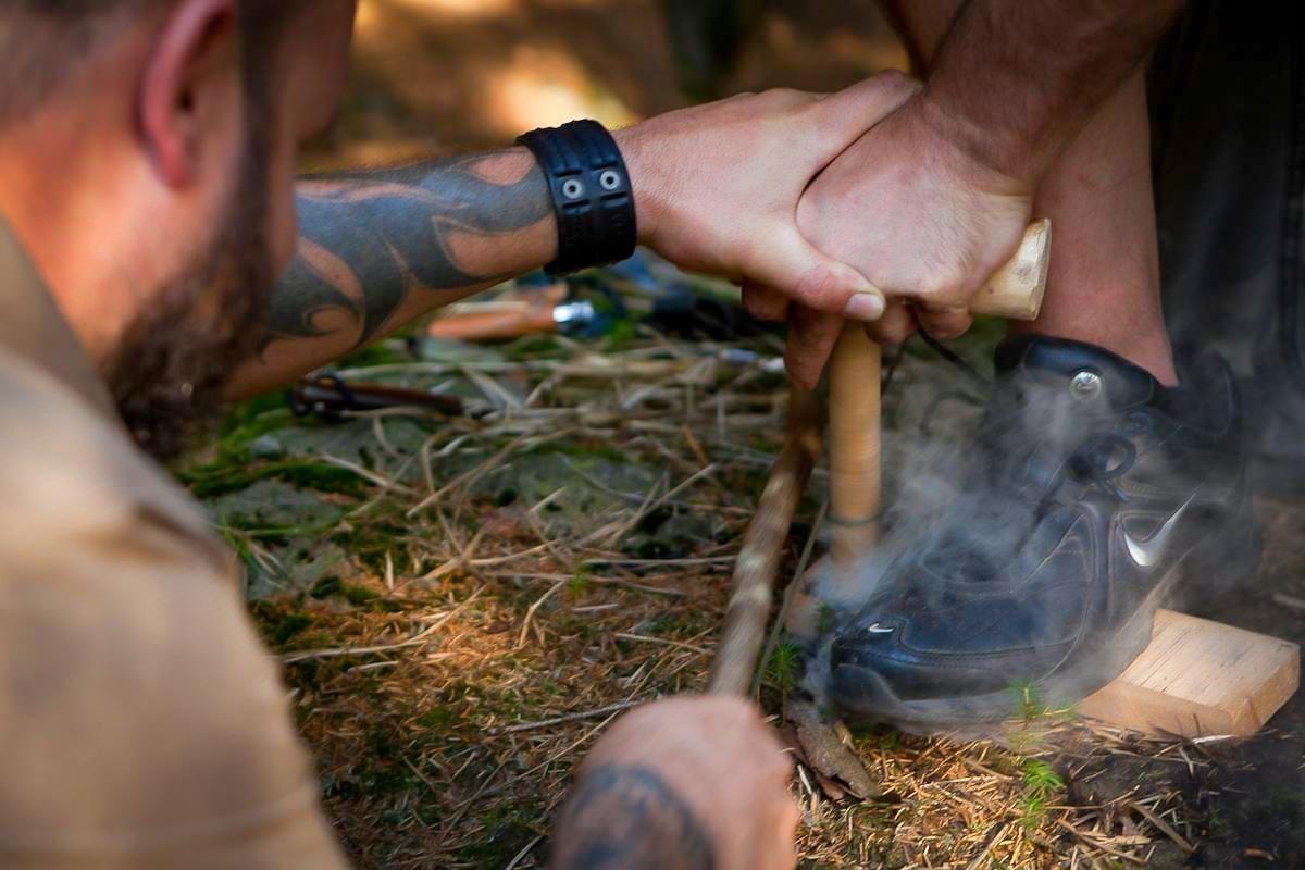 Hände greifen sich gegenseitig, während ein Holzstück für Feuerbohrer vorbereitet wird