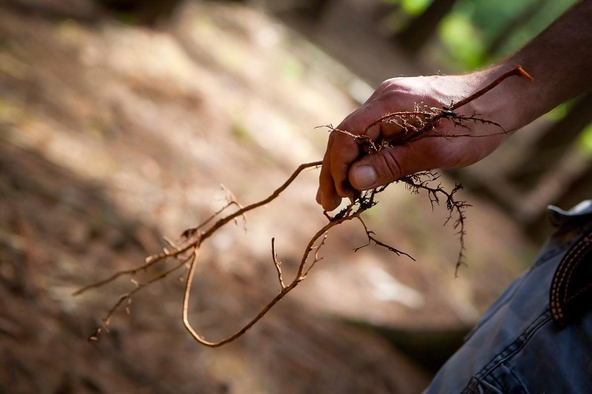Hand hält eine dünne Wurzel mit feinen Verästelungen im Wald