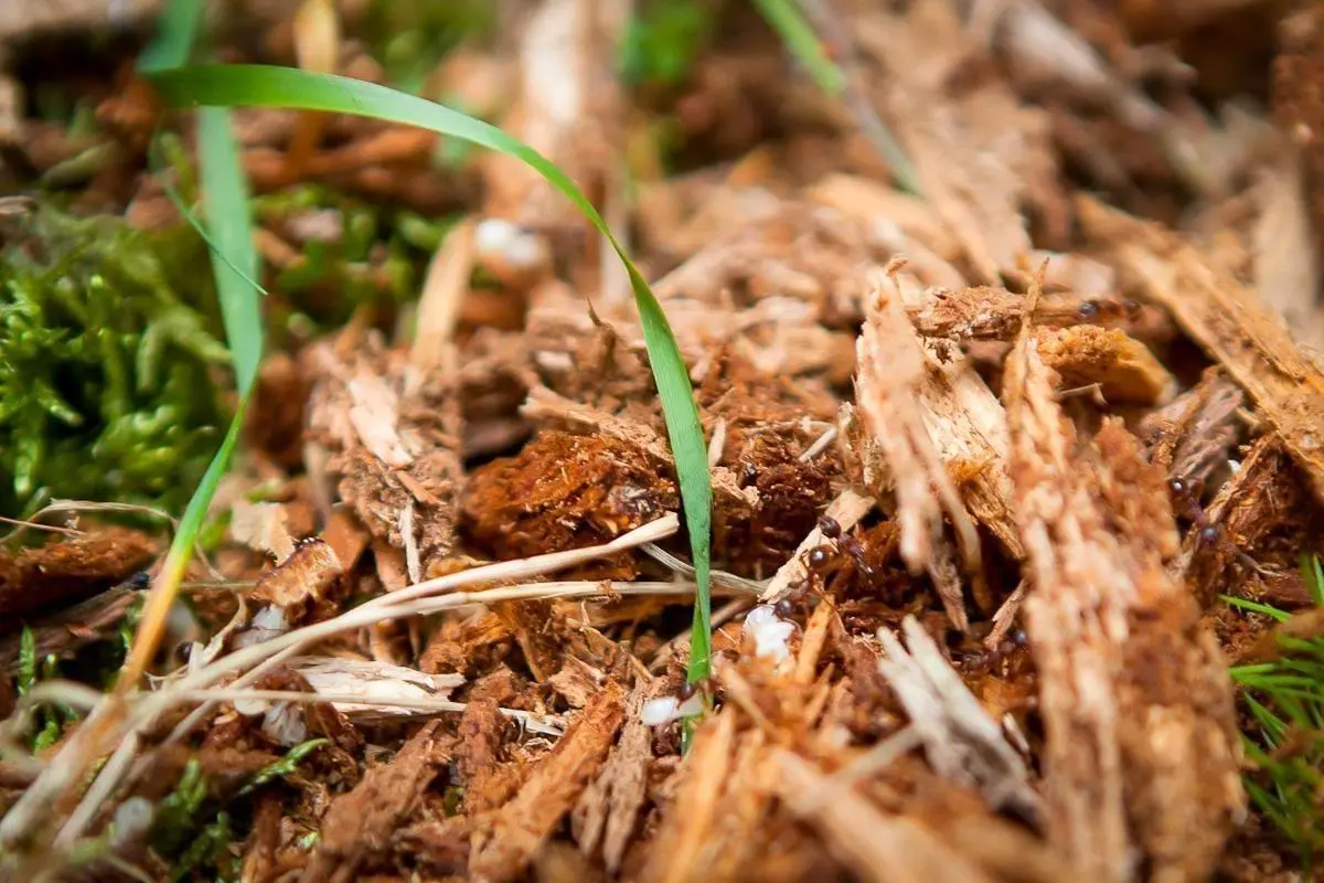 Holzhackschnitzel und Gras wachsen auf feuchtem Boden