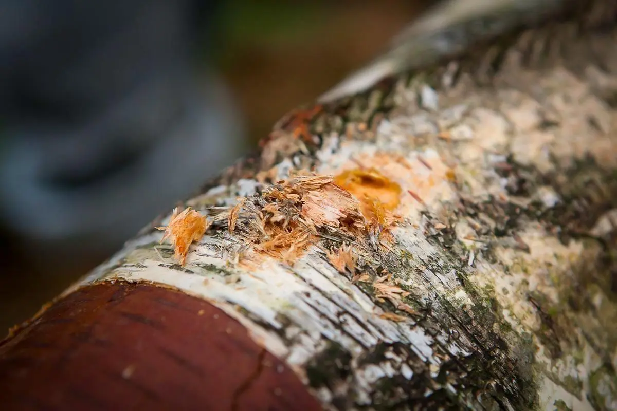 Holzstück mit Rinde und Spänen, bearbeitet mit einem Messer