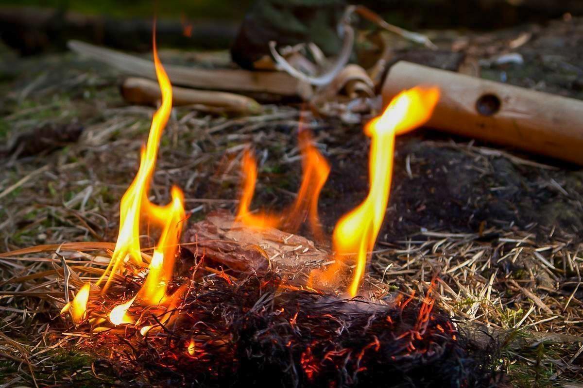 Zunder glimmt und kleine Flamme entsteht auf dem Boden