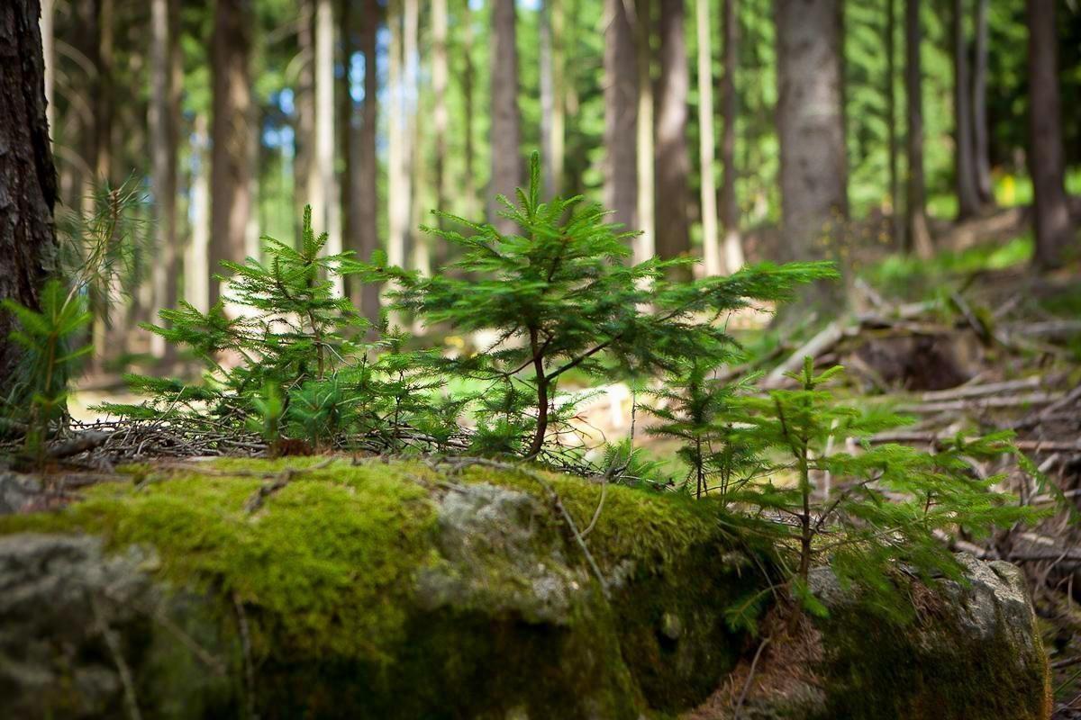 Kleine Nadelbäume wachsen auf einem moosbedeckten Stein im Wald
