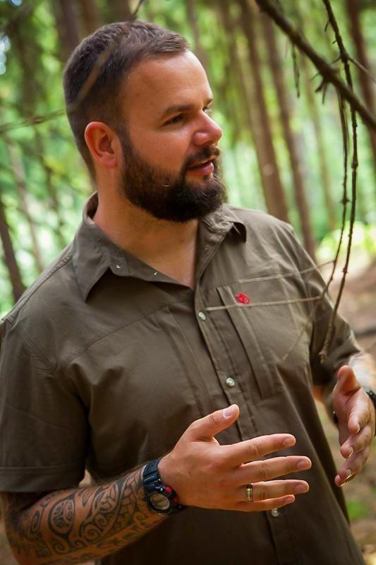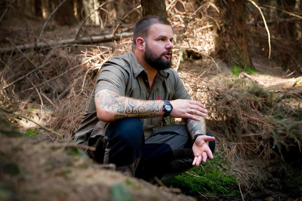 Kniend in einem Wald, erklärt jemand eine Technik mit gestikulierenden Händen