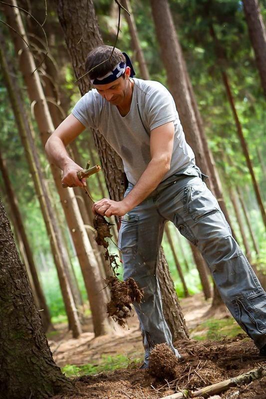 Mann gräbt mit einem Messer in der Erde zwischen Bäumen