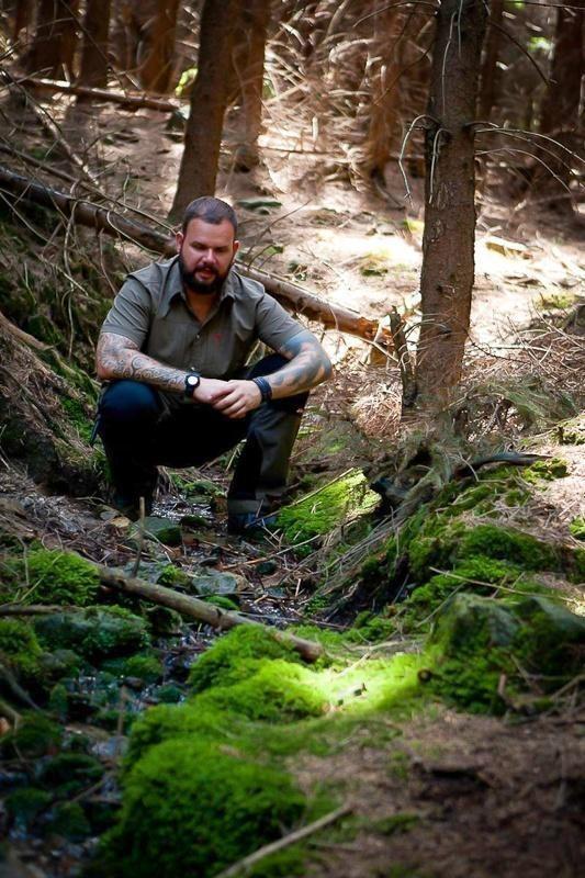 Mann hockt in einem Waldgebiet neben einem kleinen Bachlauf auf moosbedecktem Boden
