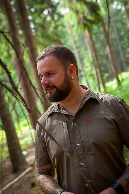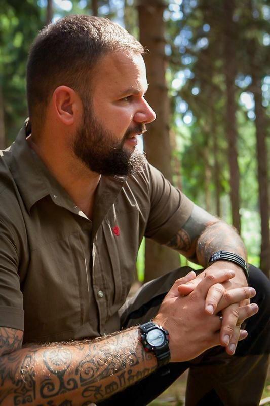 Mann sitzt im Wald, Hände gefaltet, mit Tätowierungen und Armbanduhr