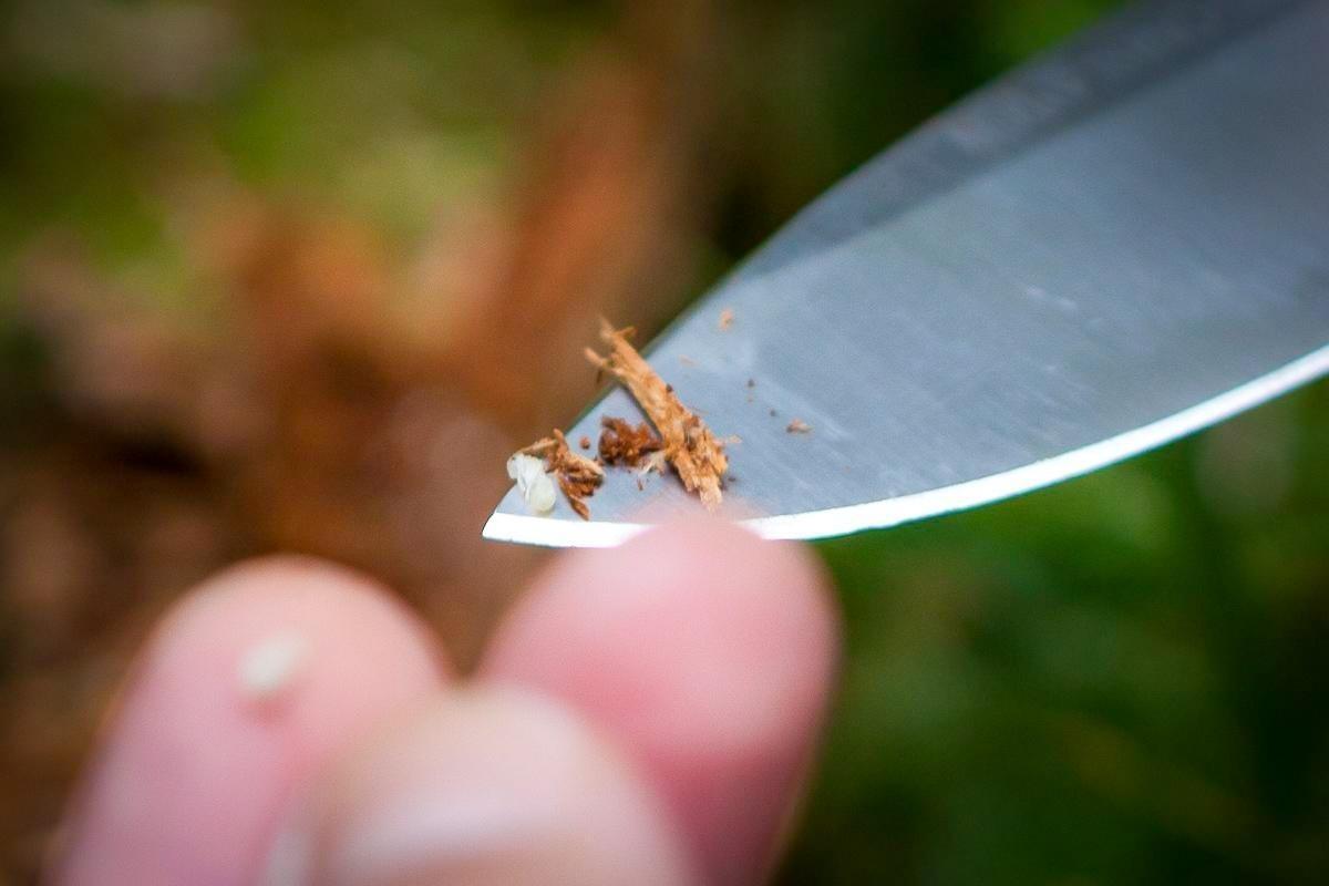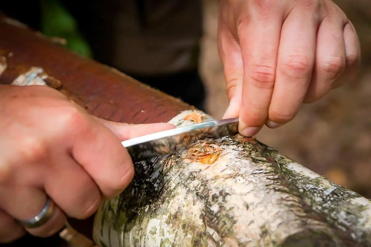 Messer schneidet Rinde von einem Holzstück zur Herstellung von Zunder