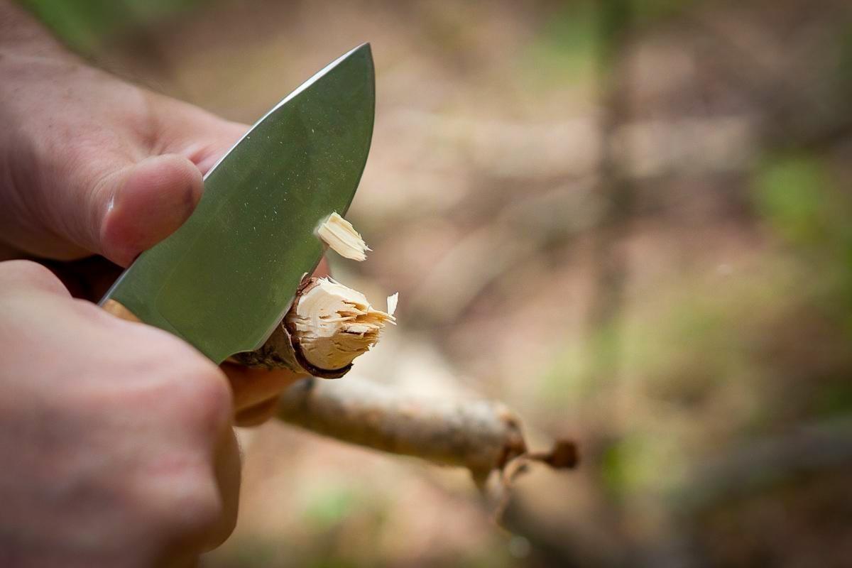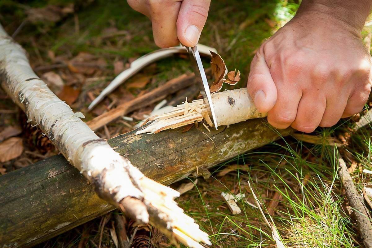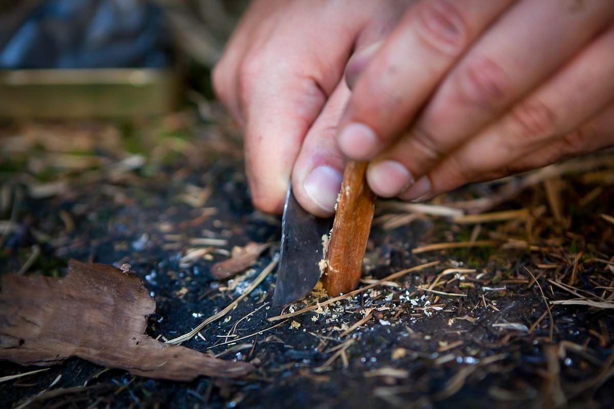 Holzstück wird mit einem Messer bearbeitet, um Zunder zu erzeugen