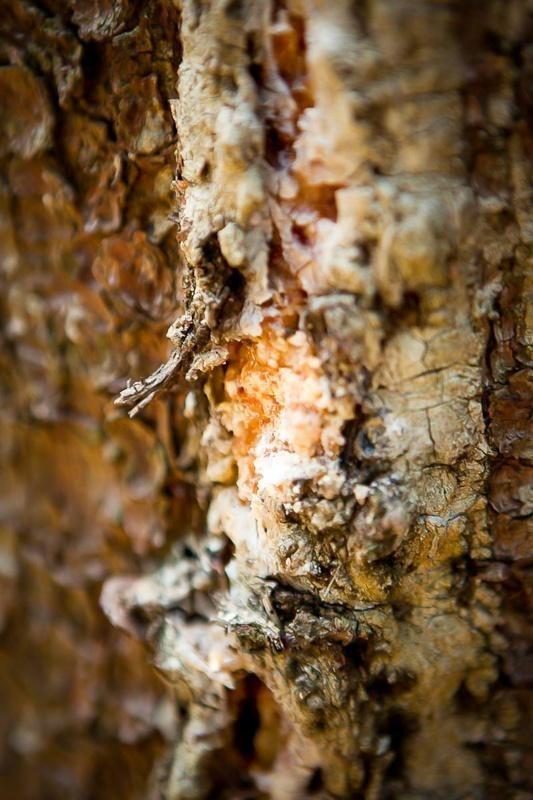 Nahaufnahme von Baumrinde mit sichtbaren Rissen und Harz