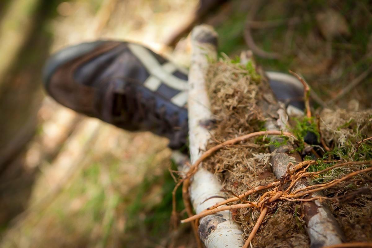 Selbstgebaute Konstruktion aus Ästen und Moos mit einem Schuh im Hintergrund