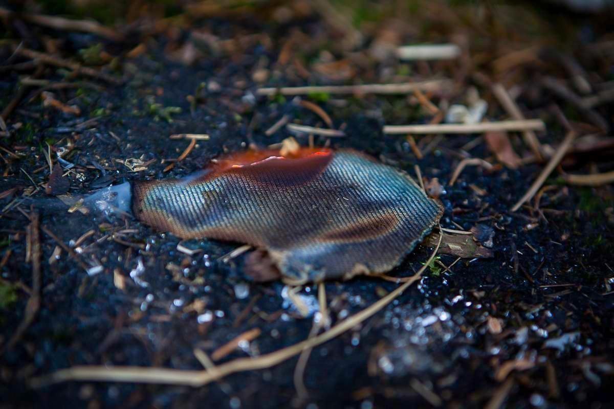 Rauch steigt von einem Holzstück auf, während ein Schuh darauf drückt