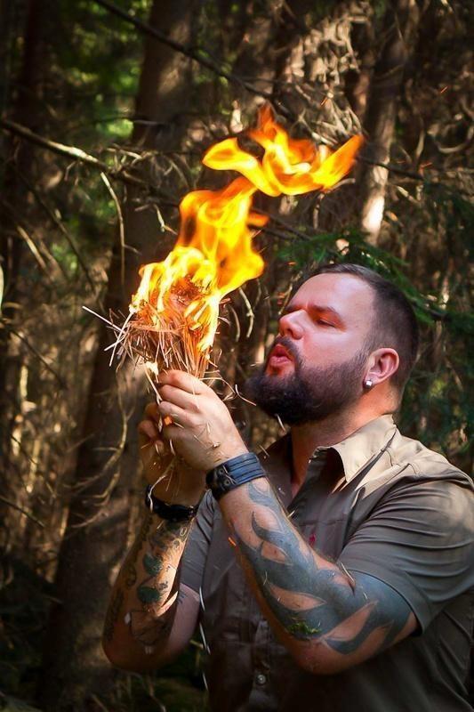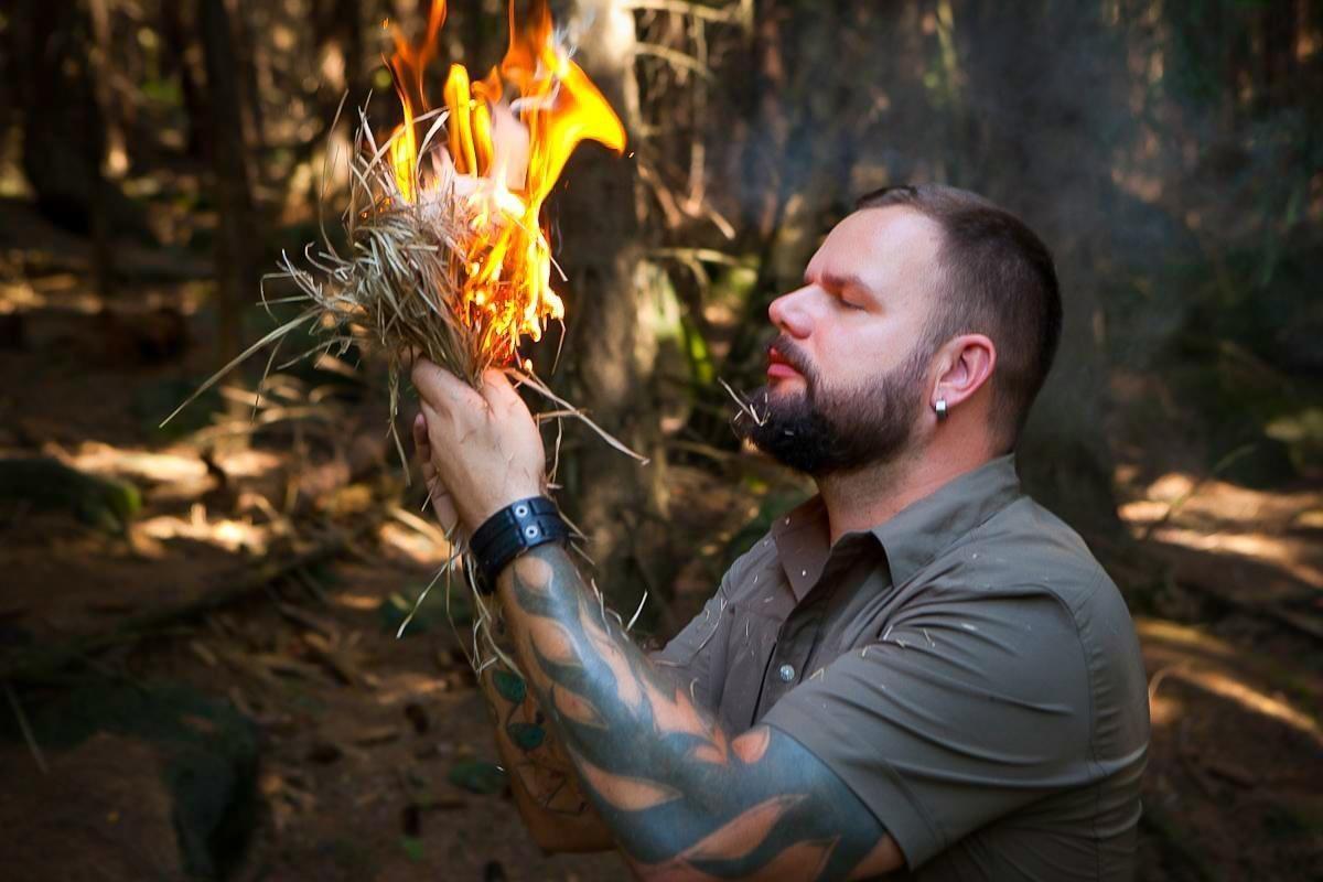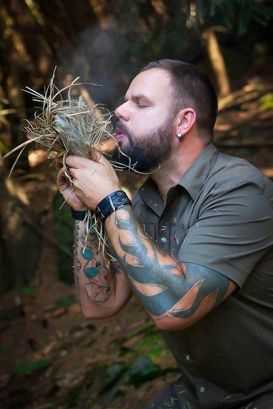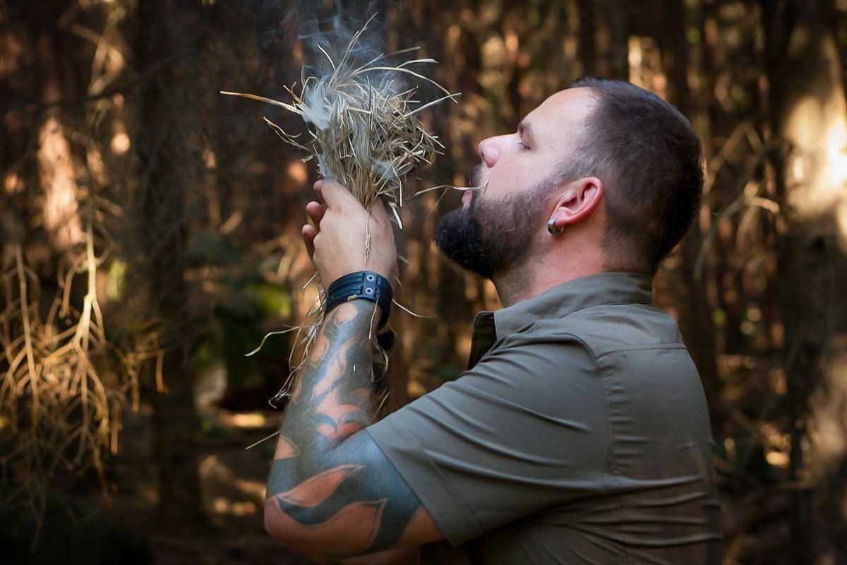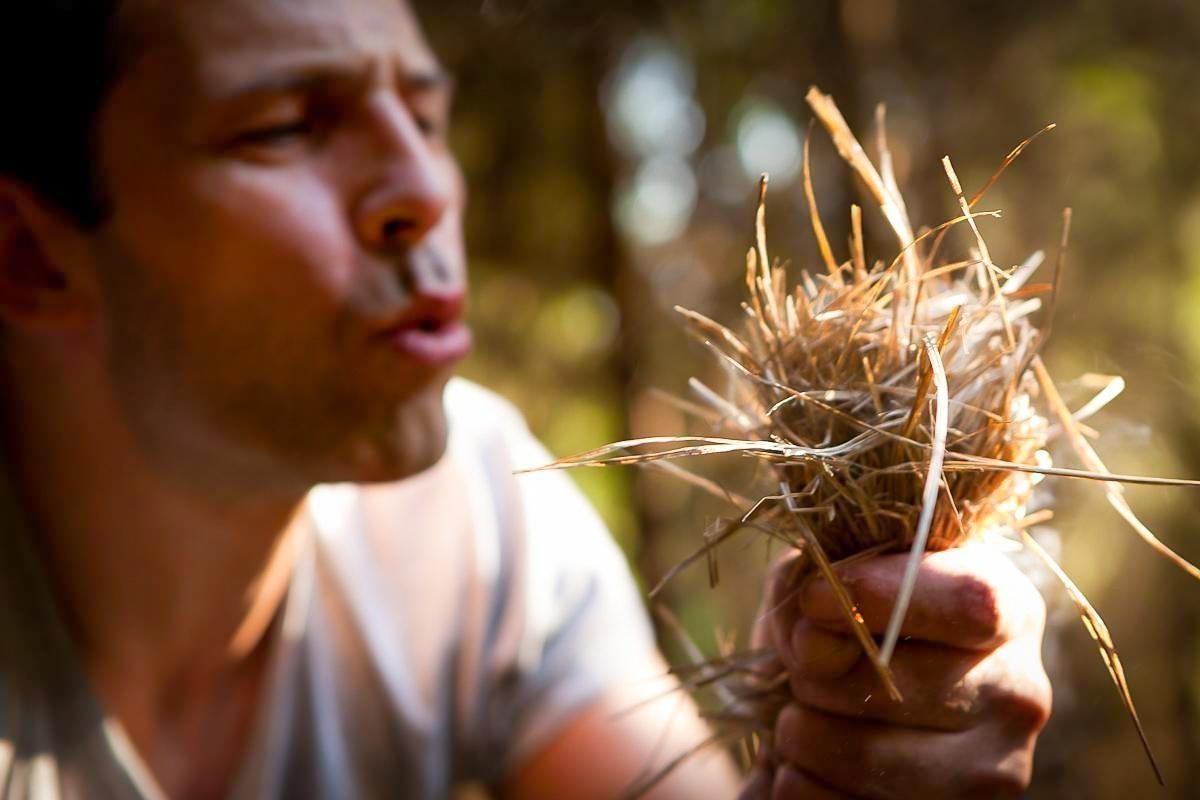 Zunder glimmt in der Hand, während eine kleine Flamme entsteht