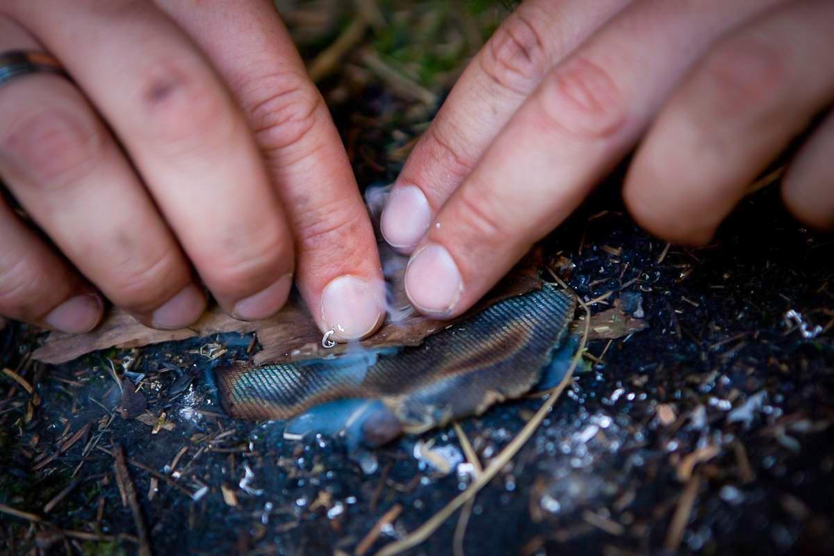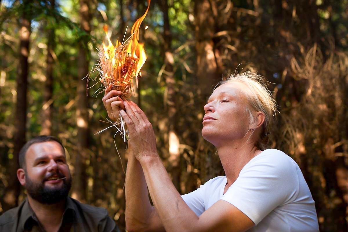 Zunder wird auf einem Stein vorbereitet, während zwei Personen konzentriert arbeiten