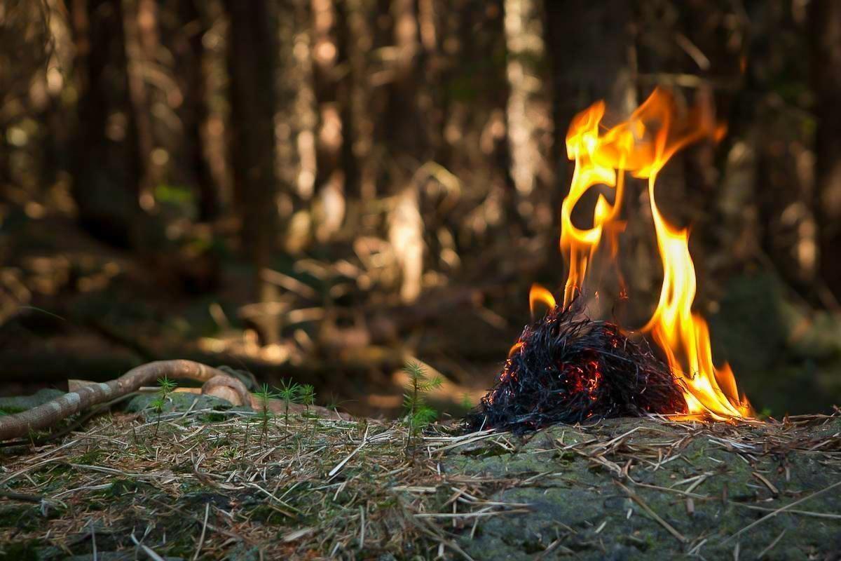 Zunder glimmt mit kleiner Flamme auf einem Stein im Wald