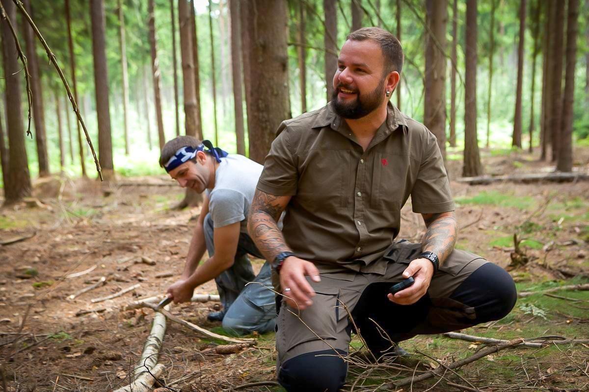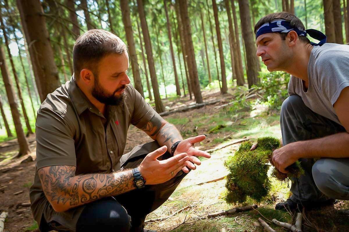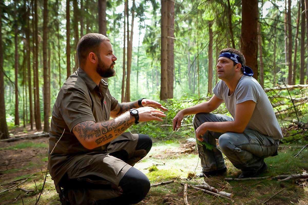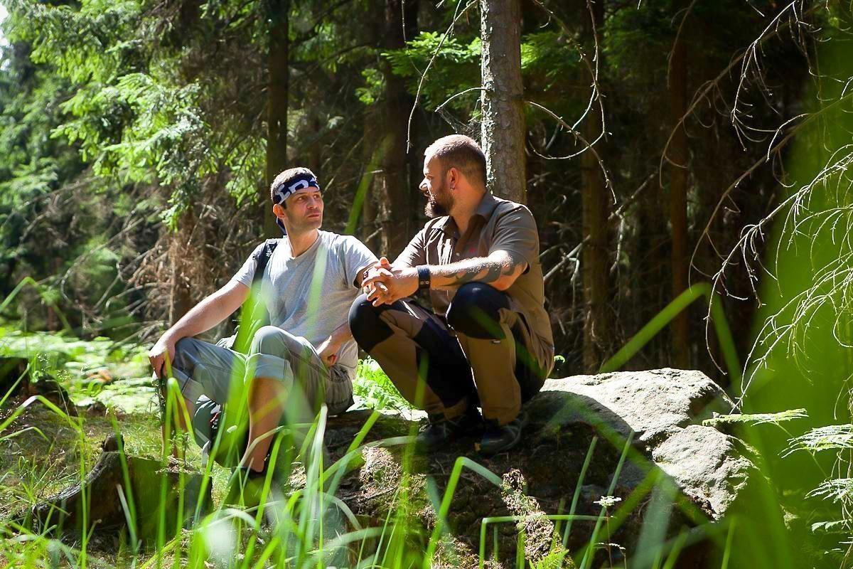 Zwei Personen sitzen im Wald und diskutieren gestikulierend über Survival-Techniken