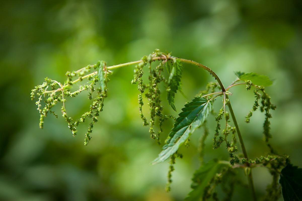 Zweig mit grünen Blättern und kleinen Blütenständen in unscharfem Hintergrund