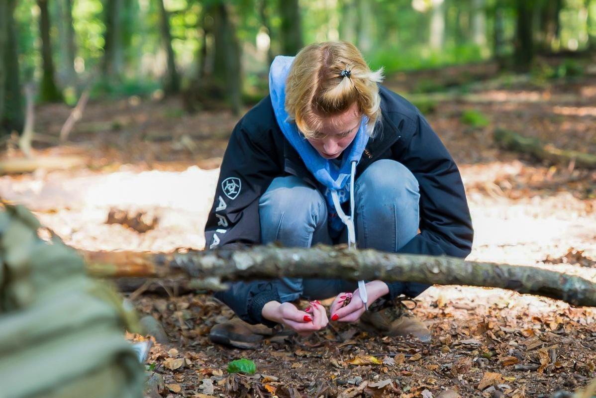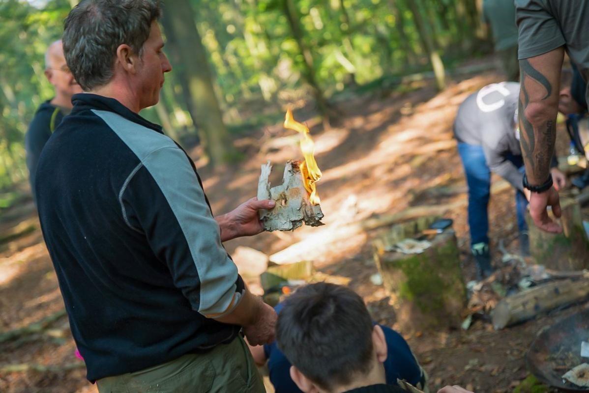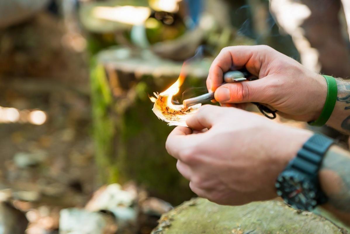 Ein Teilnehmer zündet Zunder mit einem Feuerstahl an einem Holzstück an