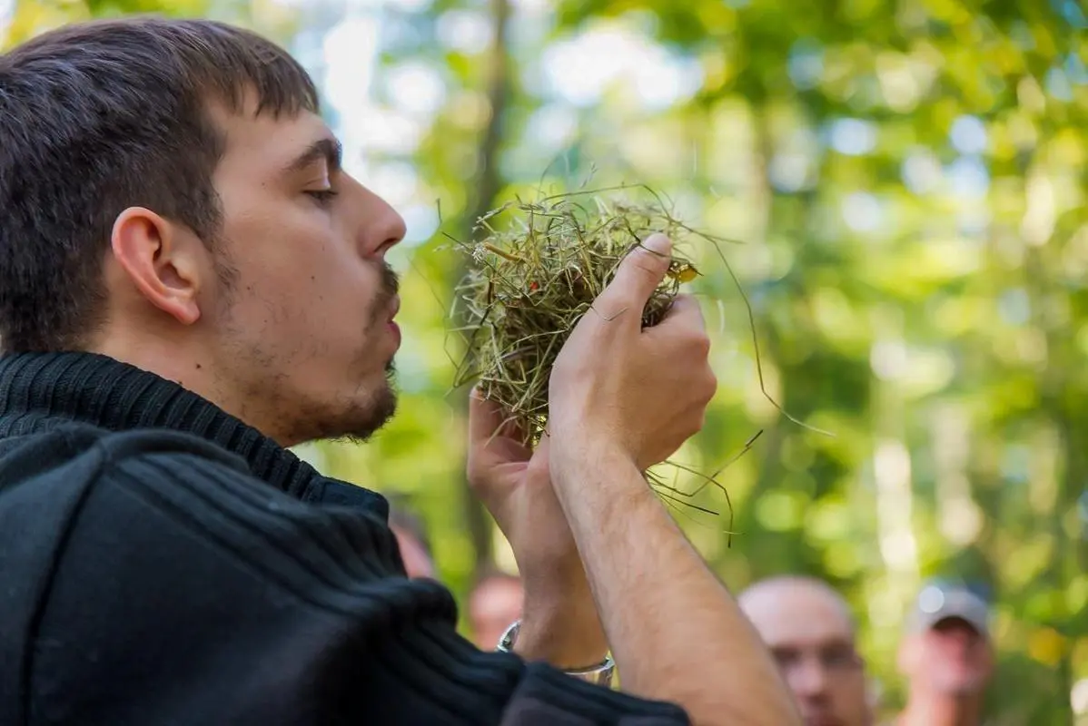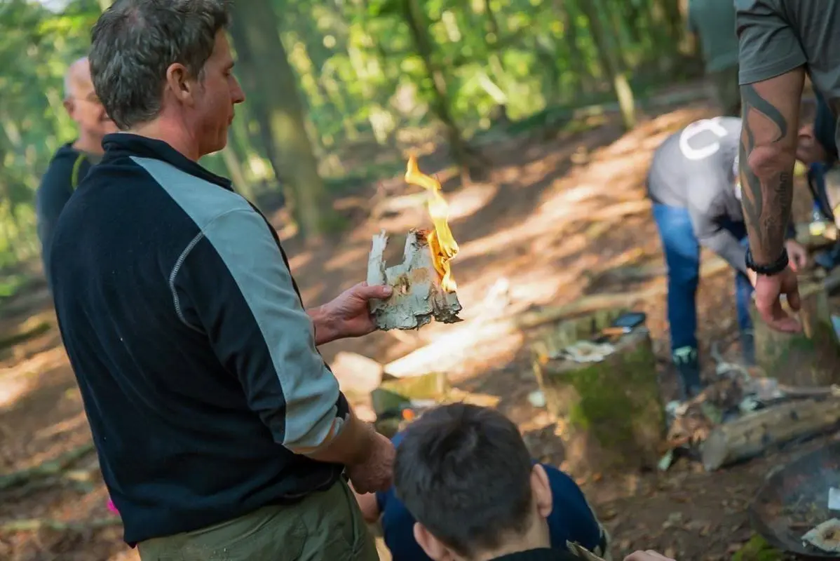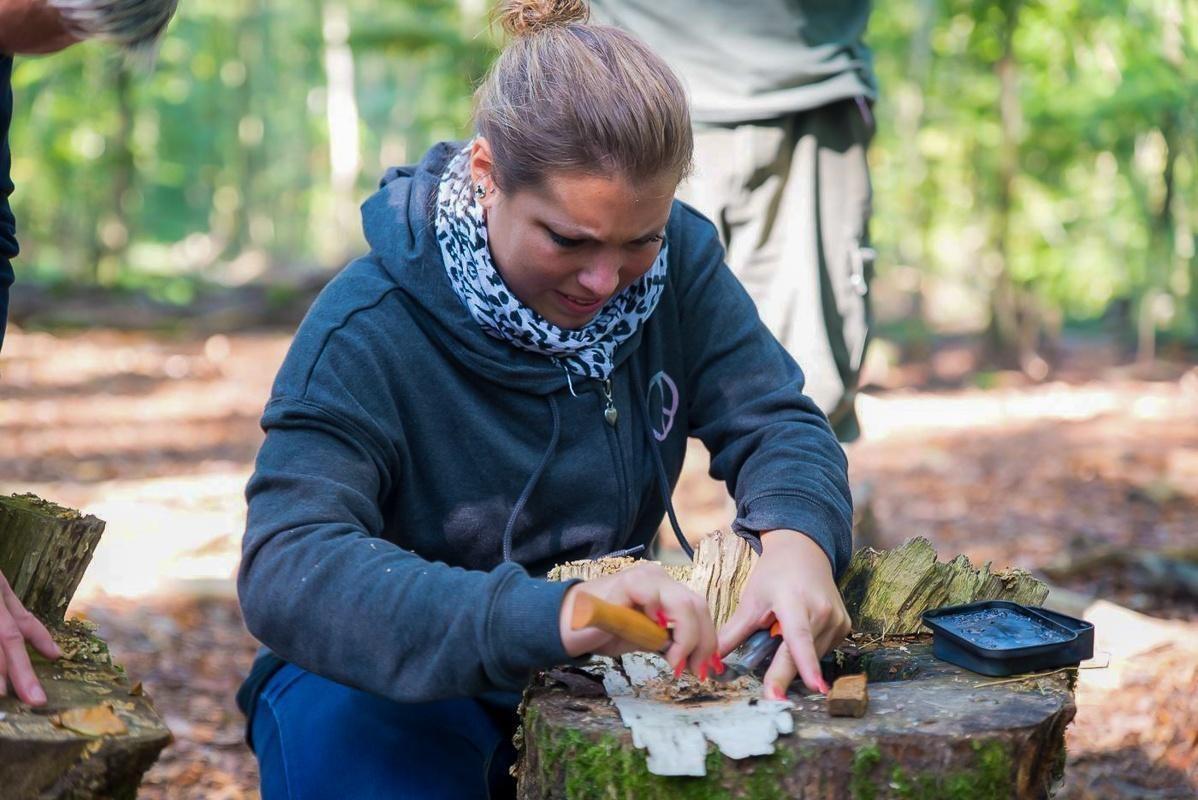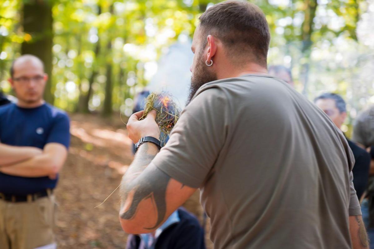 Teilnehmer üben im Wald das Entzünden von Feuer mit Zunder und Feuerstahl
