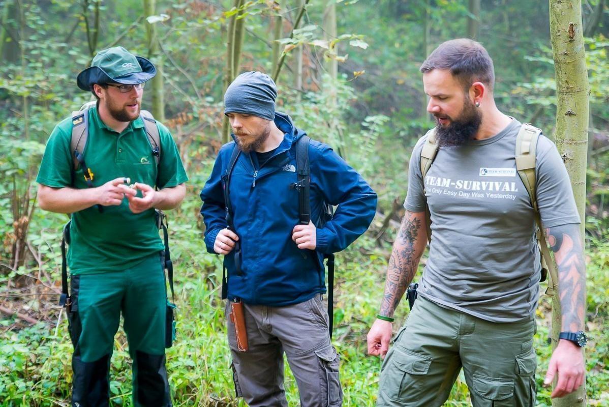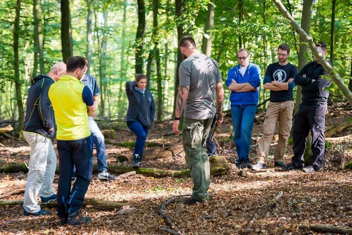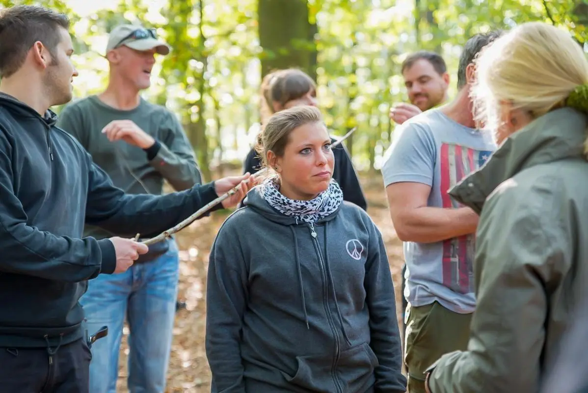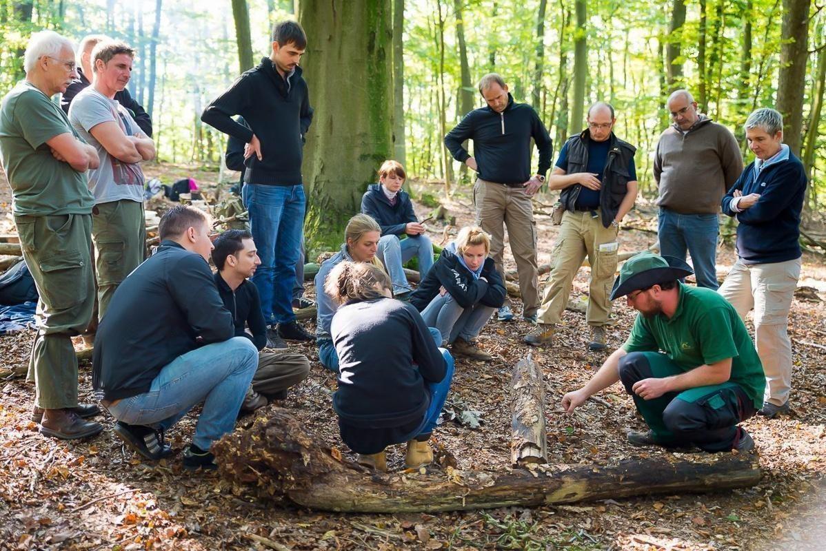 Gruppe hört einem Vortrag im Wald über Überlebenstechniken zu