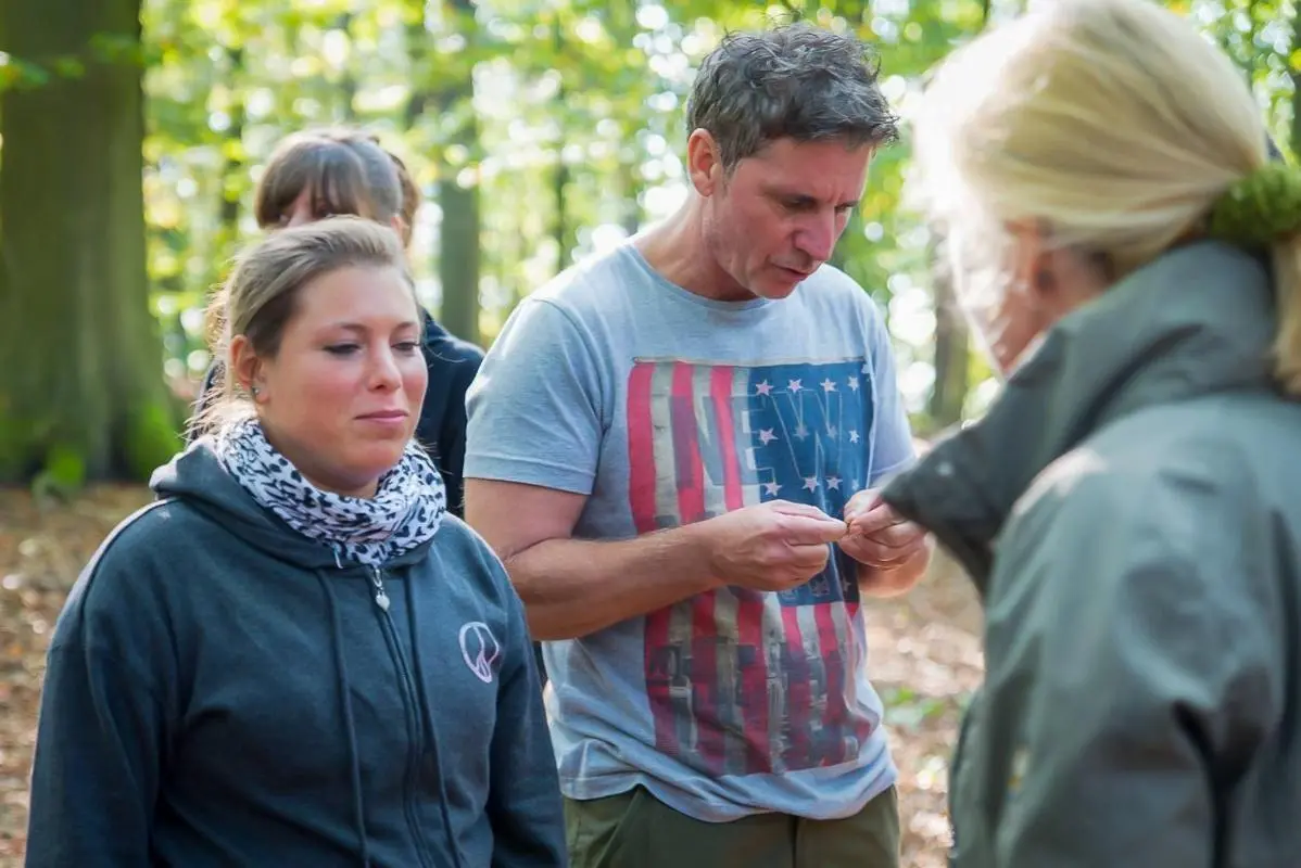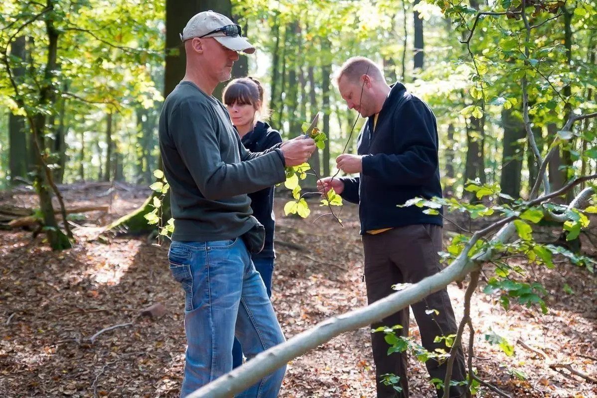 Teilnehmer untersuchen Pflanzenmaterial im Wald während einer Schulung