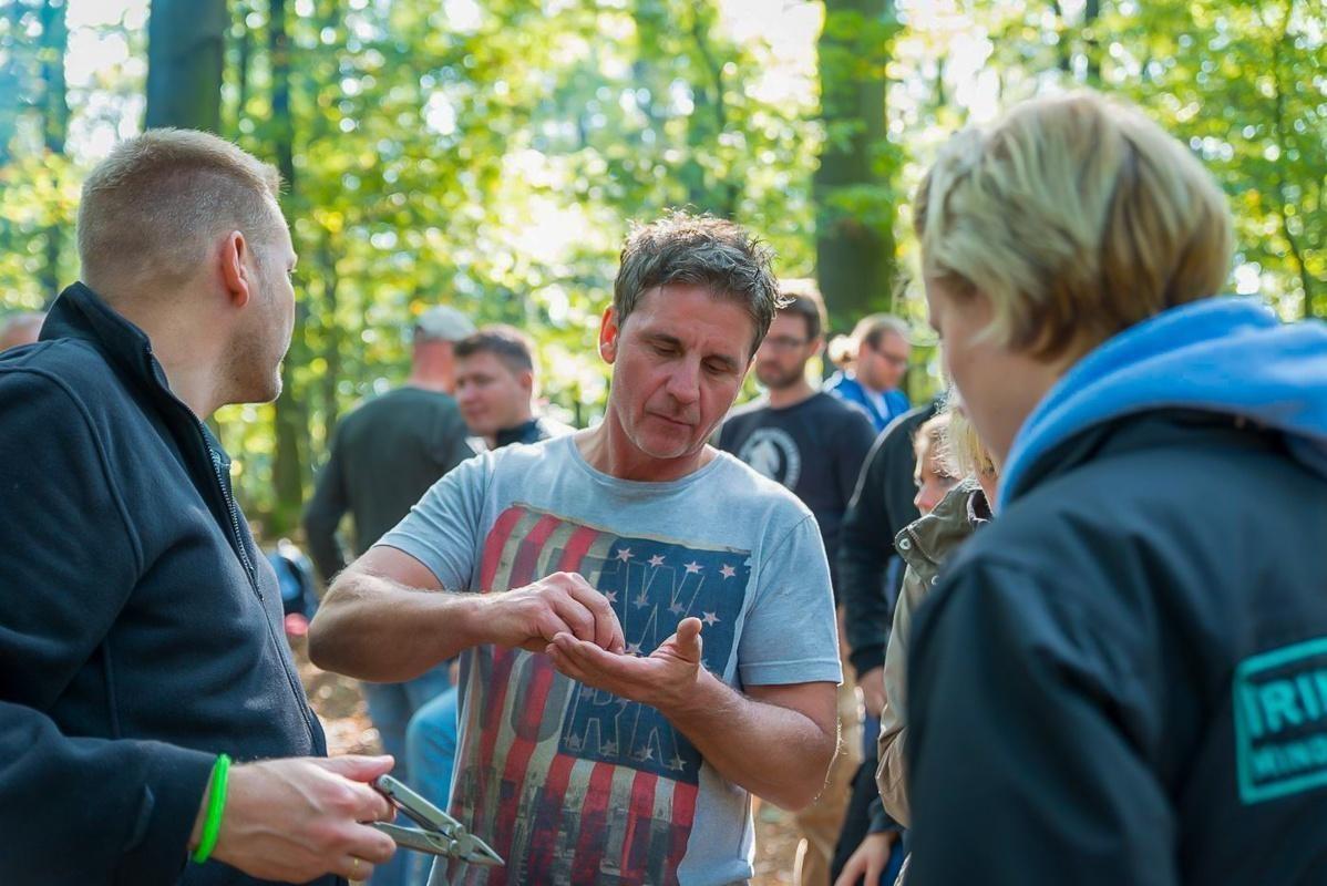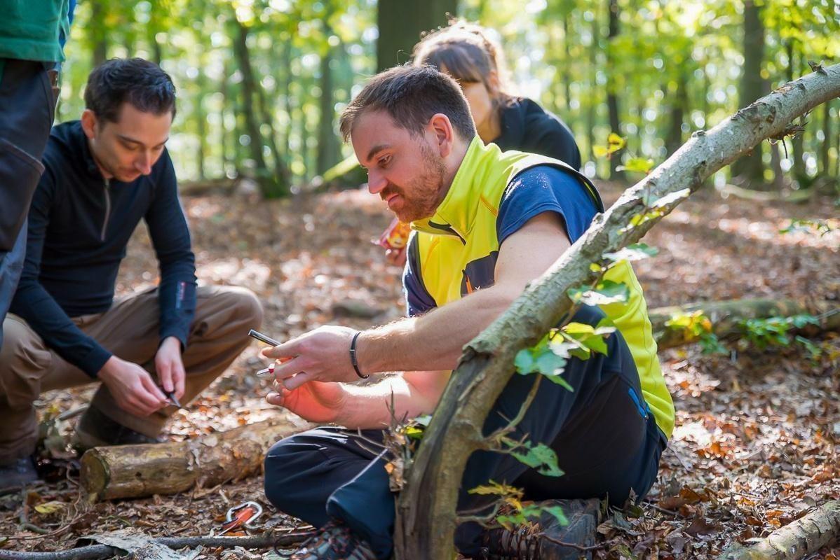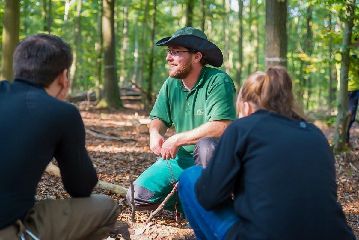 Mann zeigt anderen Teilnehmern eine Technik mit einem Werkzeug im Wald